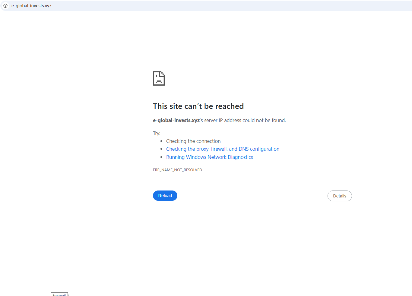 BrokersView found that the domain "e-global-invests.xyz" is currently inaccessible. This is widely regarded as a significant red flag, as the suspension of a broker's website often points to underlying regulatory or operational issues.