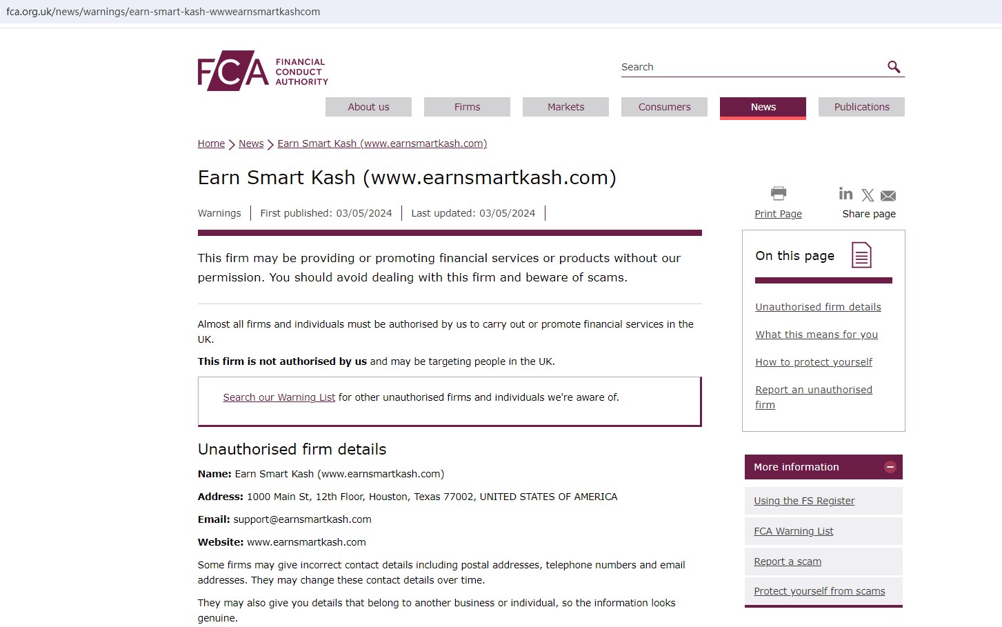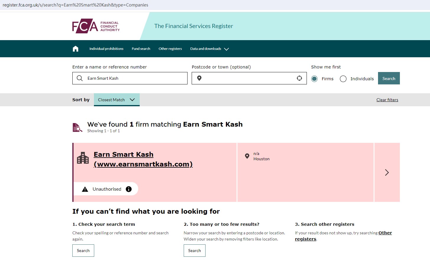 And the FCA issued a warning that Earn Smart Kash (www.earnsmartkash.com) was providing financial services or products in the UK without authorisation.