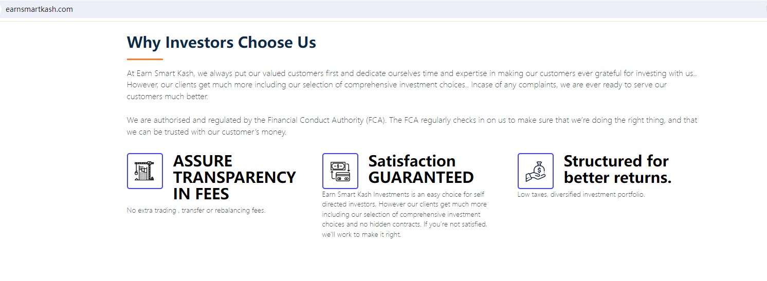 Earn Smart Kash claims to be a financial company located in the USA, which is authorised and regulated by the Financial Conduct Authority (FCA), offering wide range of financial services, including Forex, Binary Options, Cryptocurrencies and more instruments in global markets.