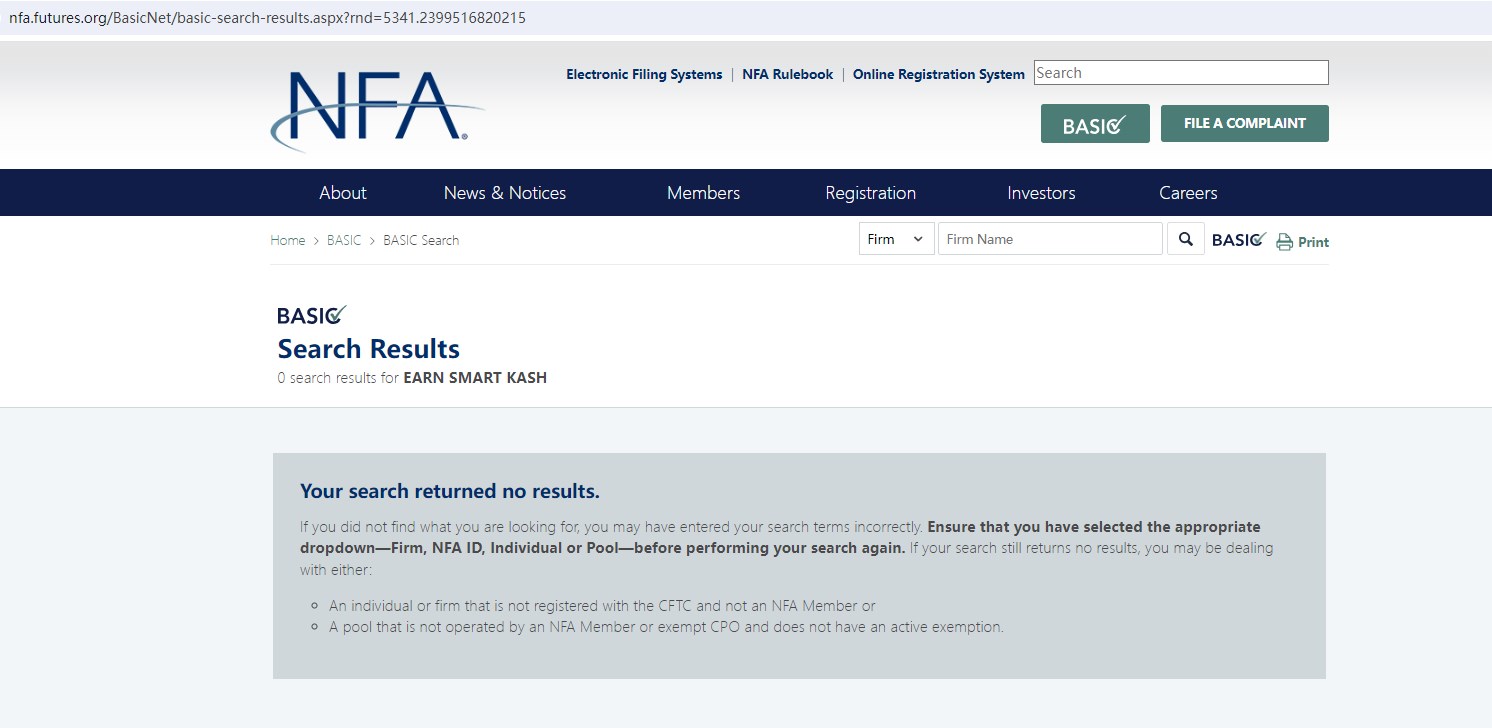 Upon investigation, we found that Earn Smart Kash is not regulated by the FCA and the US National Futures Association (NFA).