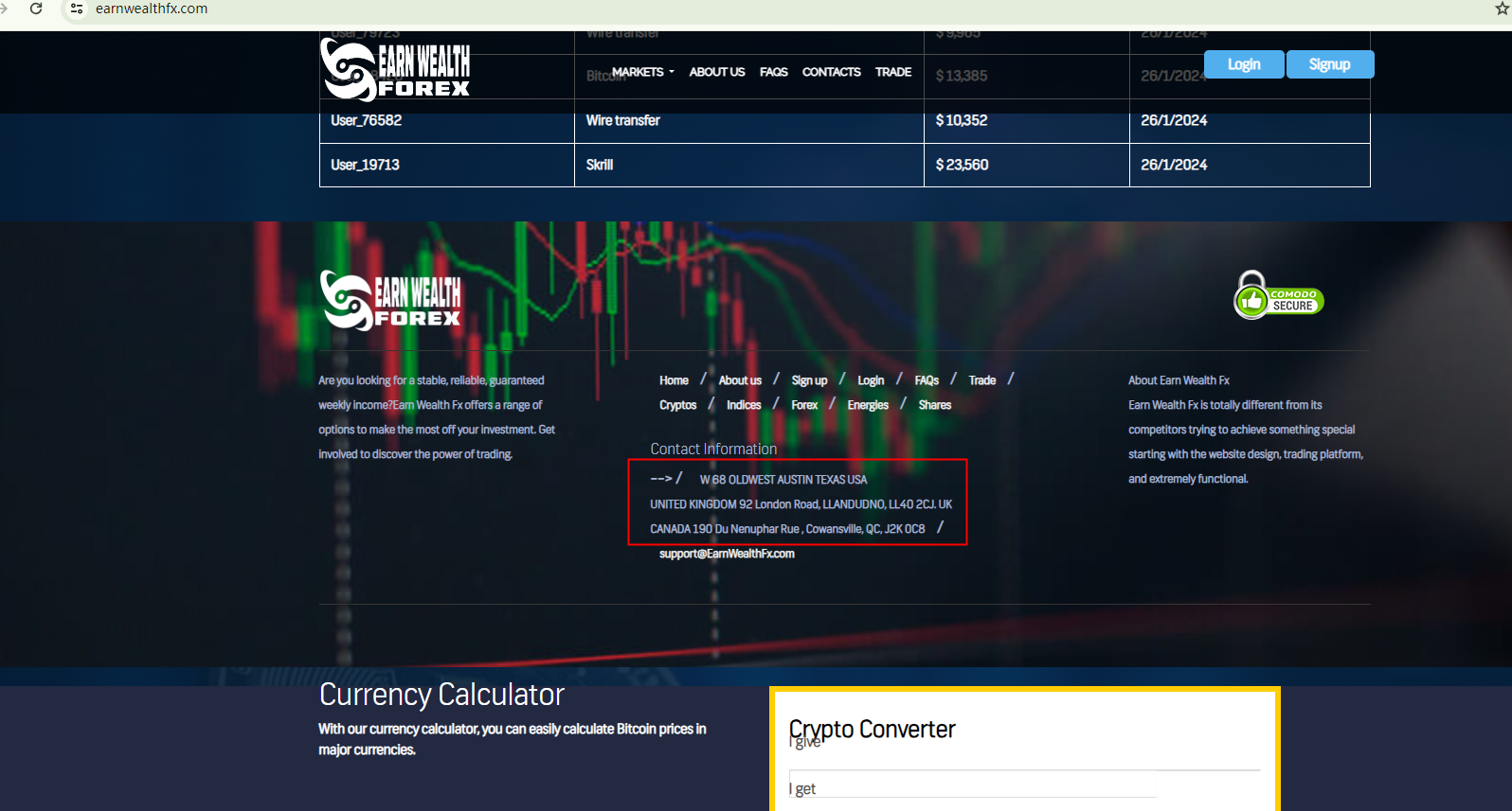A comparison between these two websites indicates that EARN WEALTH FX and VASTCRYPTOWAVEOPTIONS are strikingly similar, sharing identical content, products, testimonials, the "Recent Withdrawals and Payouts" list, and even office addresses, with the exception of the brand names. Furthermore, EARN WEALTH FX has not provided any regulatory information for investors to validate its legitimacy. These findings can serve as warning signs of potential scams.