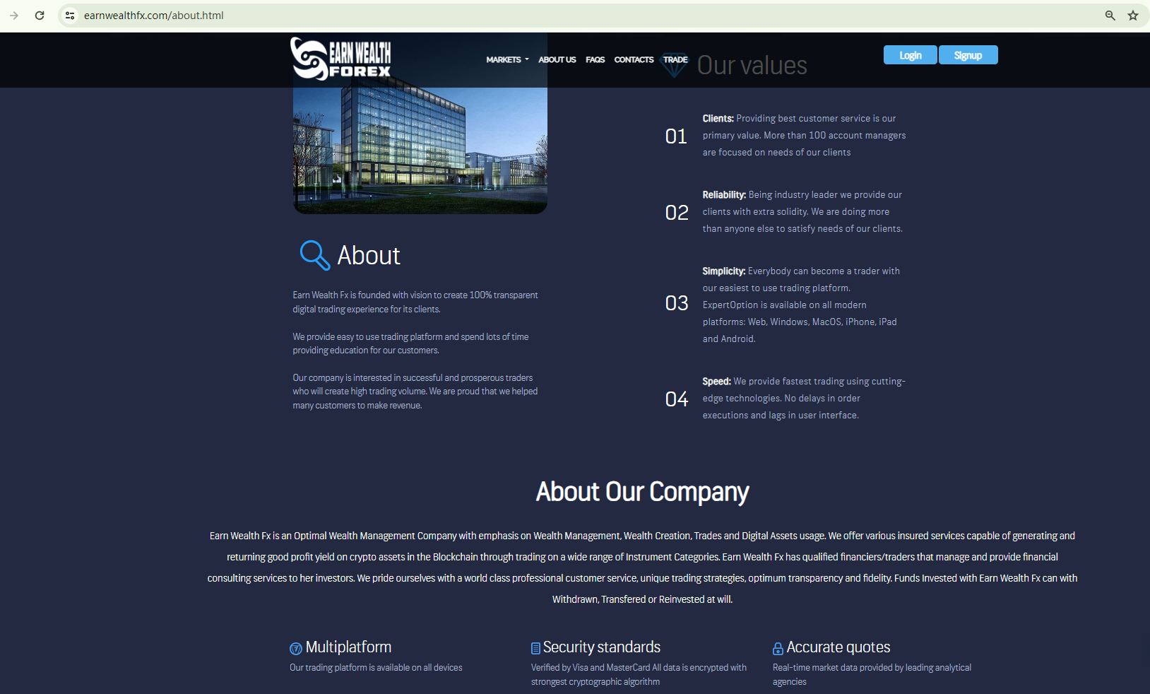 Scam websites often display certain shared characteristics. They usually have brief lifespans, vanishing once their fraudulent activities are detected, only to resurface under a new brand and web address. These sites are often hastily put together, with scammers frequently using basic forex broker website templates to expedite their scams. They simply substitute the existing brand name in the content with their own, often overlooking grammatical accuracy or logical coherence. EARN WEALTH FX is a prime example of such collective scammers. It employs the same website template as VASTCRYPTOWAVEOPTIONS, a scam previously unveiled by BrokersView.