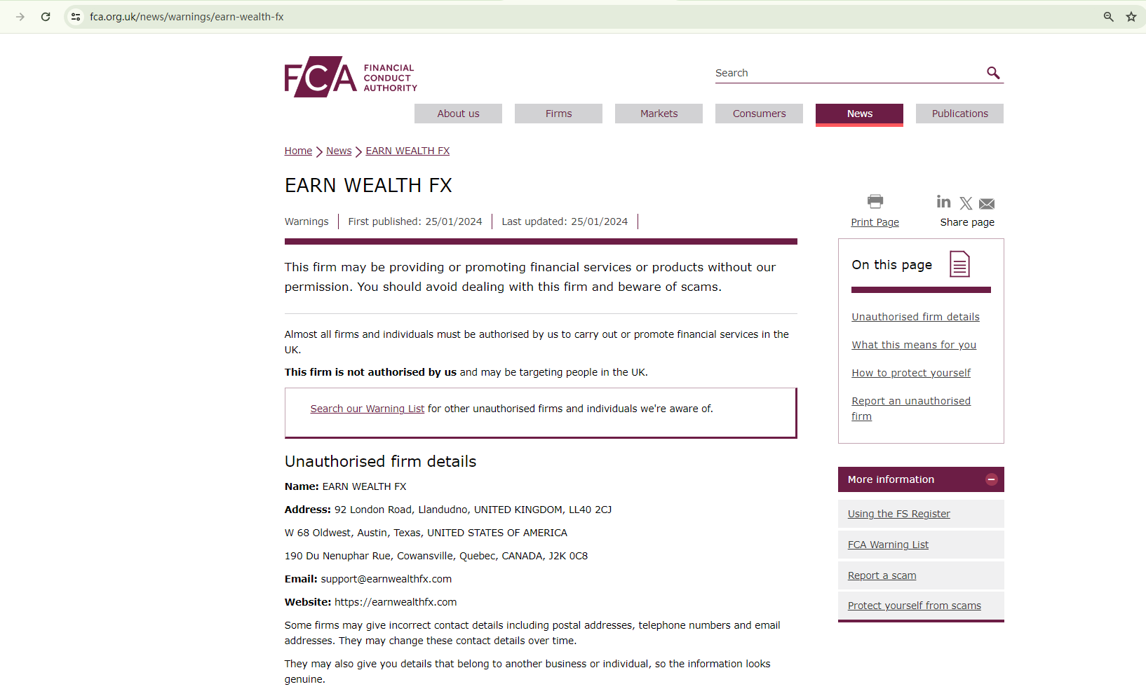 Additionally, the Financial Conduct Authority (FCA) has issued a warning against EARN WEALTH FX, suspecting that this company might be offering financial services or products in the UK without the necessary authorization.