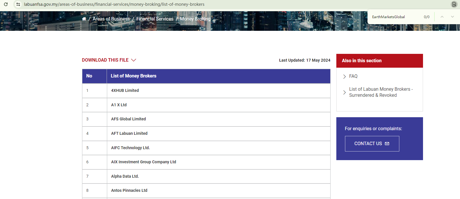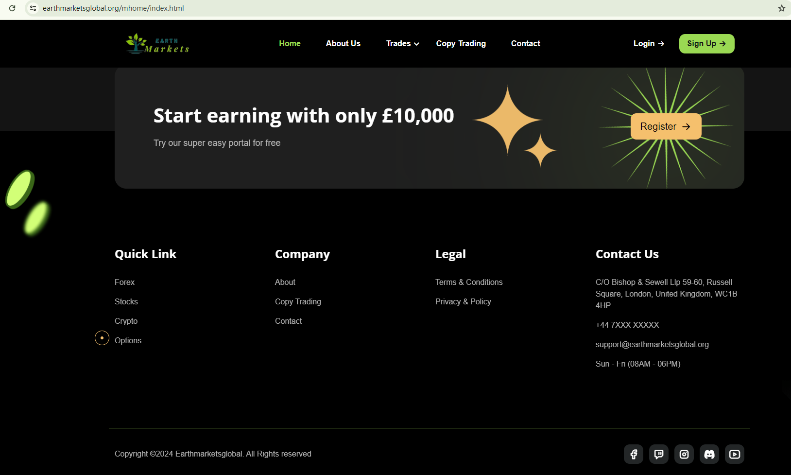 BrokersView found that the domain "https://earthmarketsglobal.org/" is currently inaccessible. This is widely regarded as a significant red flag, as the suspension of a broker's website often points to underlying regulatory or operational issues.