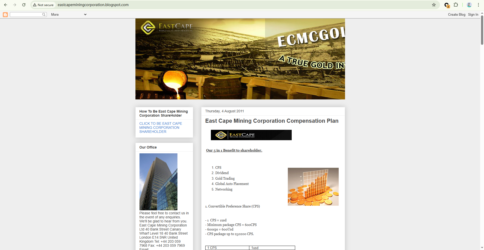 BrokersView found that the domain "http://eastcapeminingcorporation.blogspot.com/" has been acquired and now redirects to a platform in a completely different industry. This is widely regarded as a significant red flag, as the suspension of a broker's website often points to underlying regulatory or operational issues.