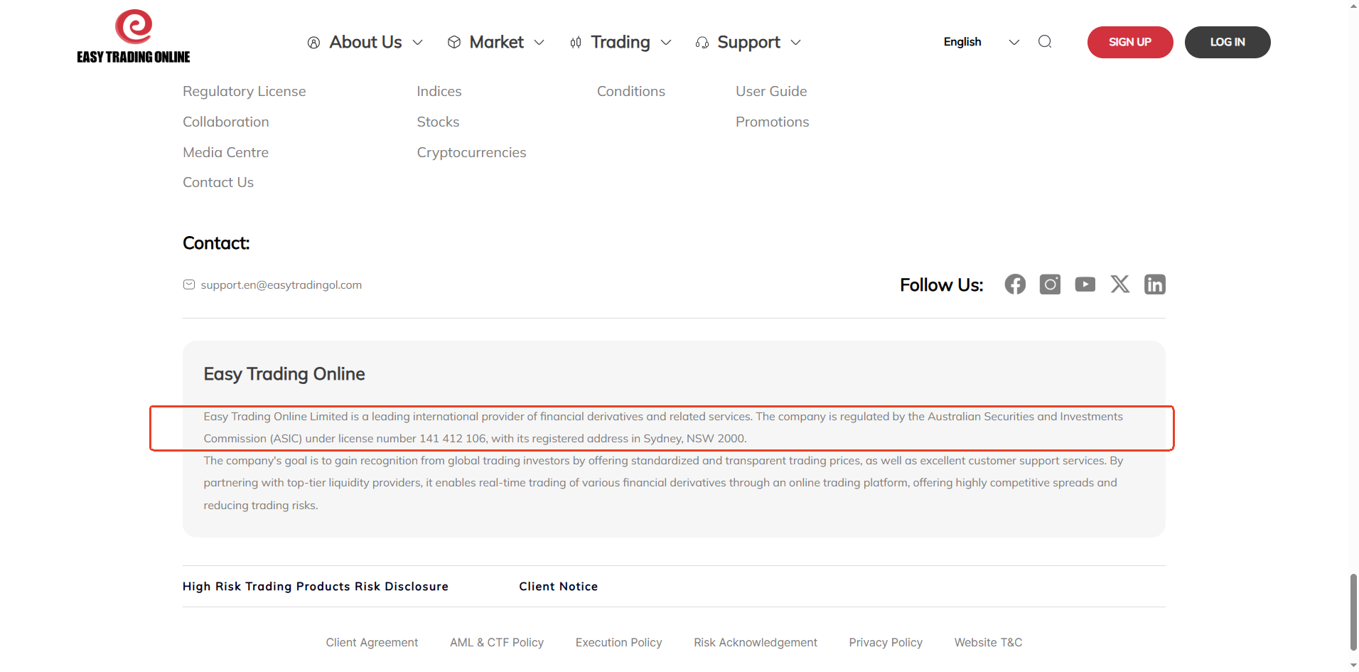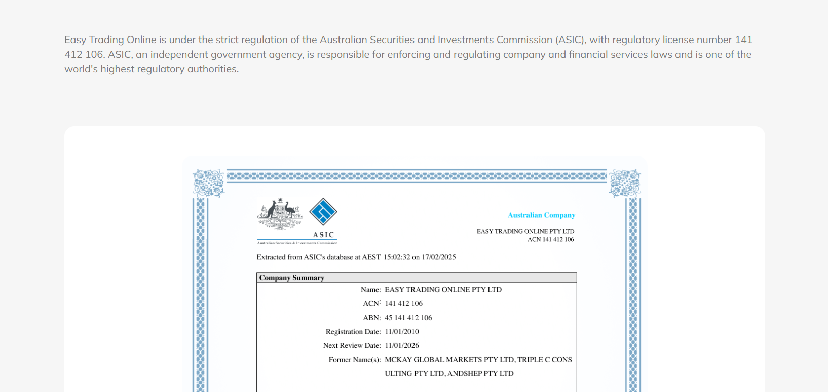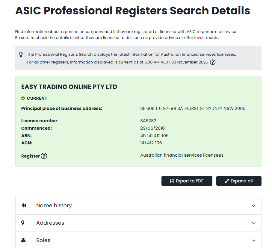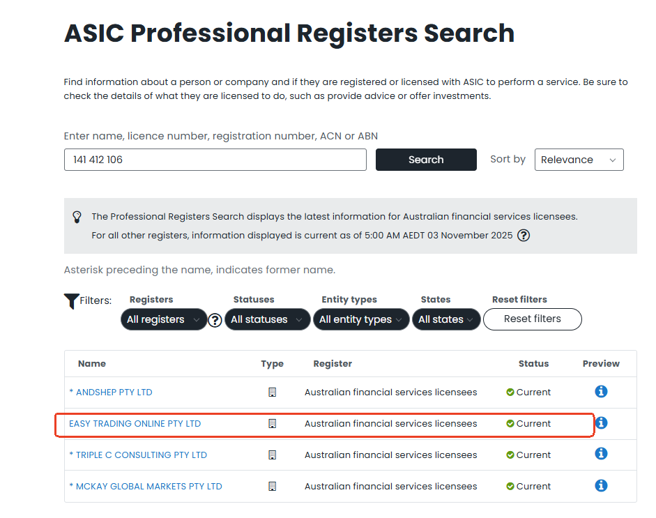 Easy Trading Online claims to be under the strict regulation of the Australian Securities and Investments Commission (ASIC) with license number 141 412 106. While our verification confirms that a company named Easy Trading Online Limited is indeed listed on the ASIC register, the website registered with ASIC does not match the operational website used by Easy Trading Online. This mismatch raises a serious concern of regulatory license misuse or license borrowing.
