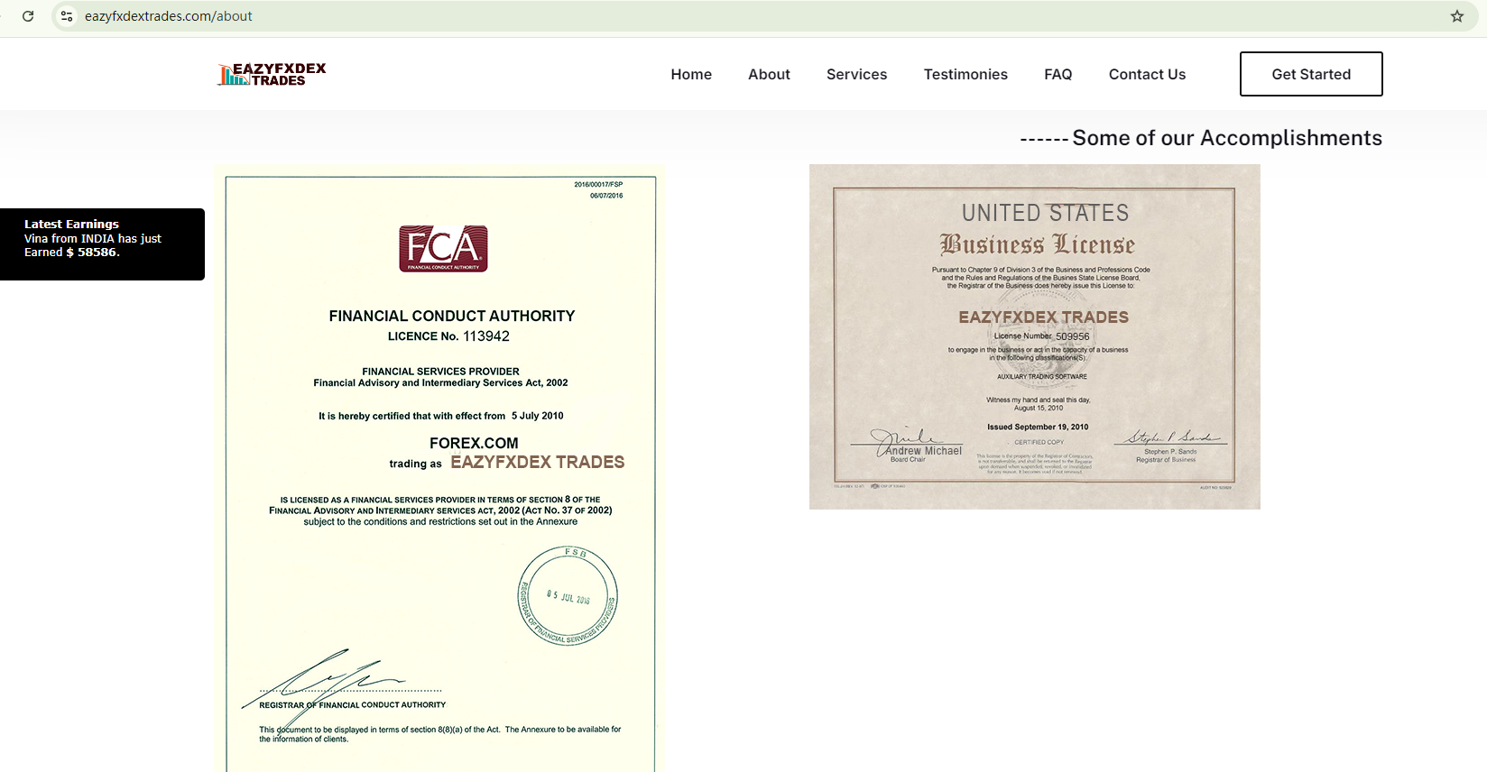 Eazyfxdex Trades claims to be regulated by displaying two licenses: one allegedly from the Financial Conduct Authority (FCA), purportedly associated with Forex.com, and another suspicious business license from the US.