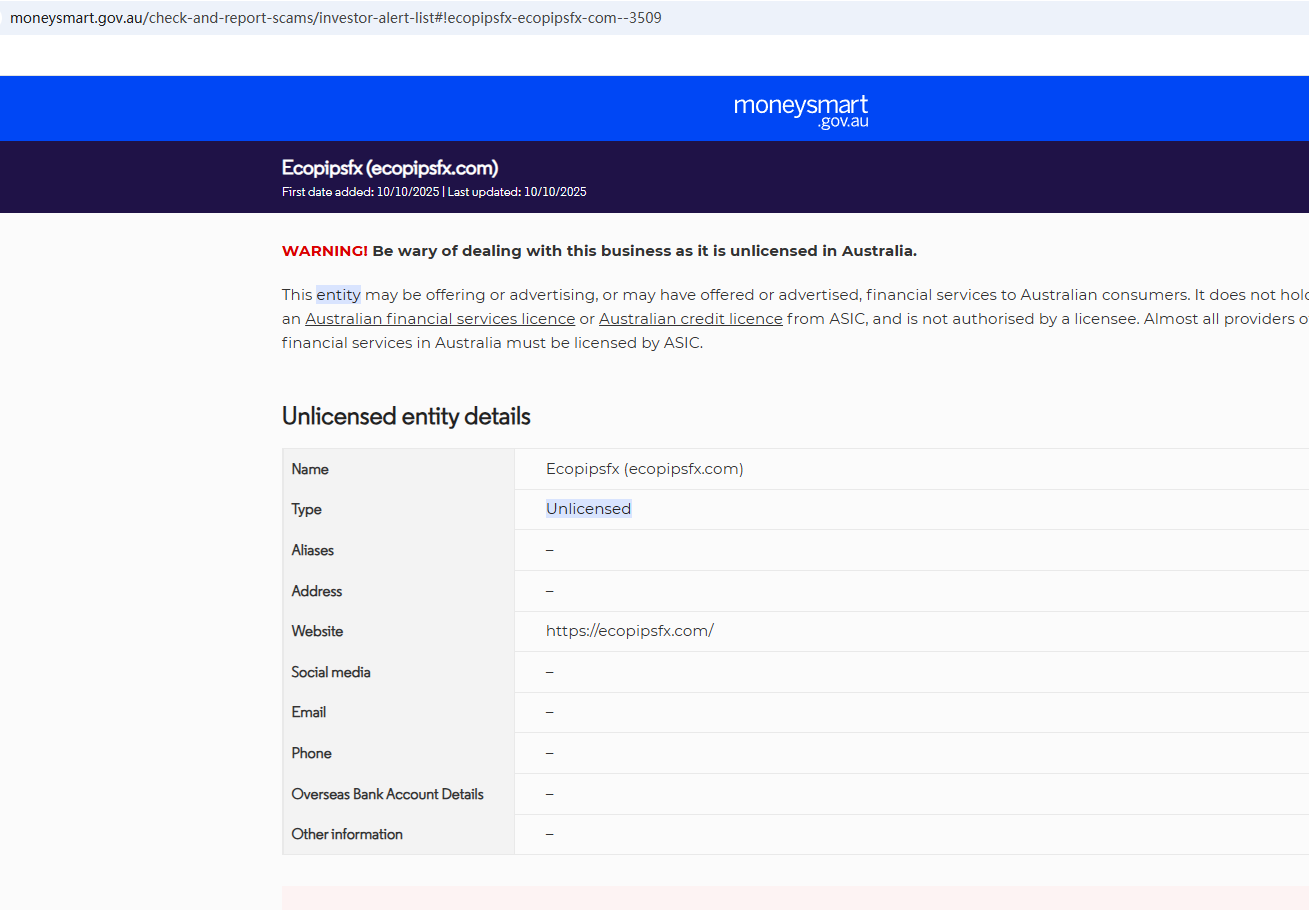 On Oct 10, 2025, the Australian Securities & Investments Commission (ASIC) issued a warning against Ecopipsfx, believing this company might be providing financial services or products without proper authorization. https://moneysmart.gov.au/check-and-report-scams/investor-alert-list#!ecopipsfx-ecopipsfx-com--3509