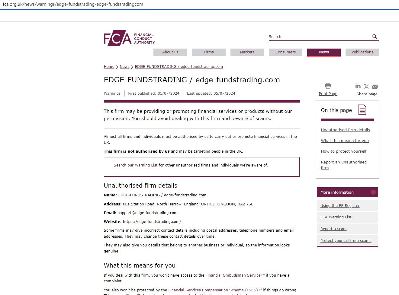 In addition, the Financial Conduct Authority (FCA) has issued a warning against EDGE FUNDSTRADING, identifying it as an unauthorized firm in the UK.