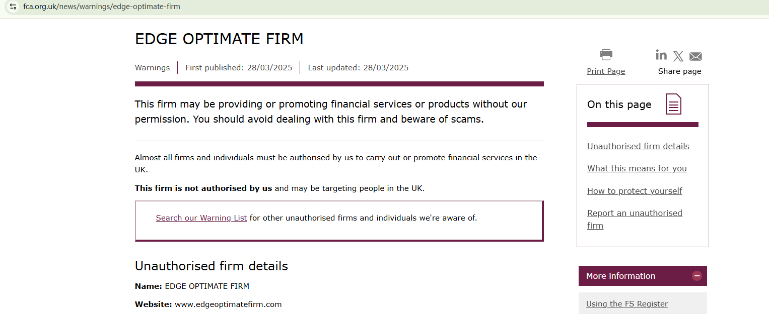 On March 28, 2025, the Financial Conduct Authority (FCA) issued a warning against EDGE OPTIMATE FIRM, believing this company might be providing financial services or products without proper authorization in the UK. https://www.fca.org.uk/news/warnings/edge-optimate-firm