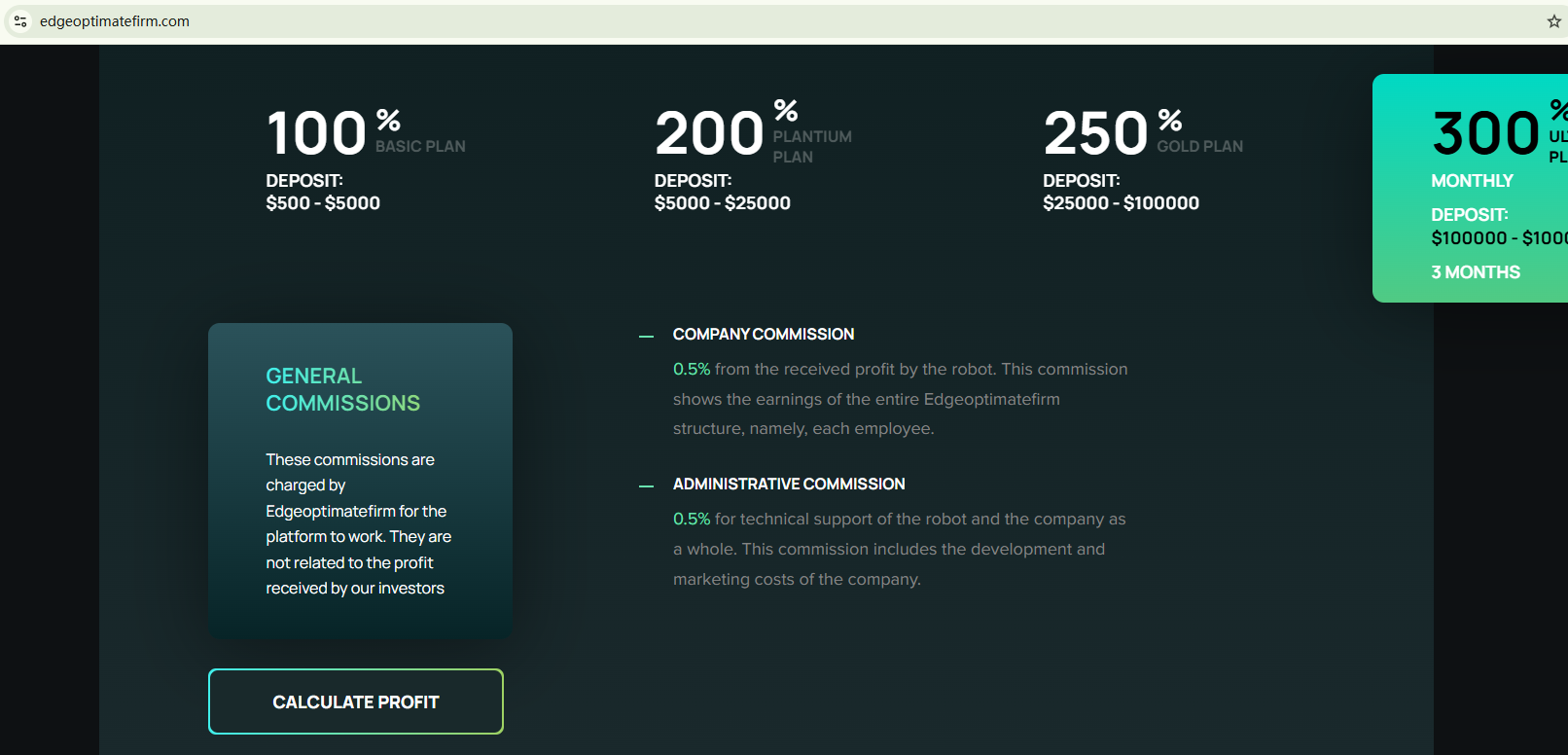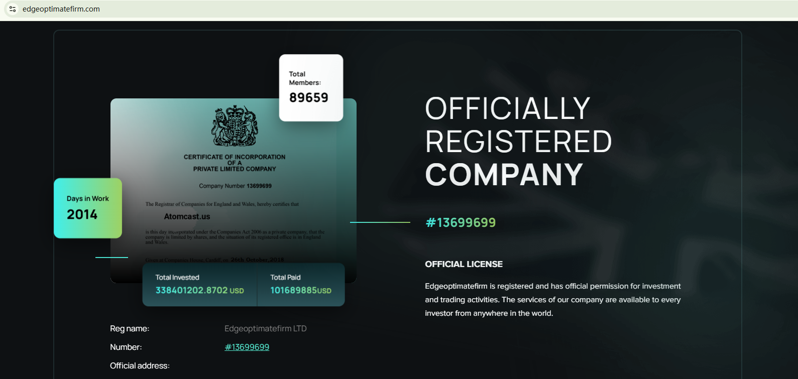 EDGE OPTIMATE FIRM merely uses a fake Companies House (CH) to appear legitimate. The company employs unrealistic high returns to allure unsuspecting investors. The website doesn't disclose any useful information about its true identity and regulatory status. All the signs point to the firm's fraudulent intention. In addition, the Financial Conduct Authority (FCA) has issued a warning against EDGE OPTIMATE FIRM for the lack of the required authorization.