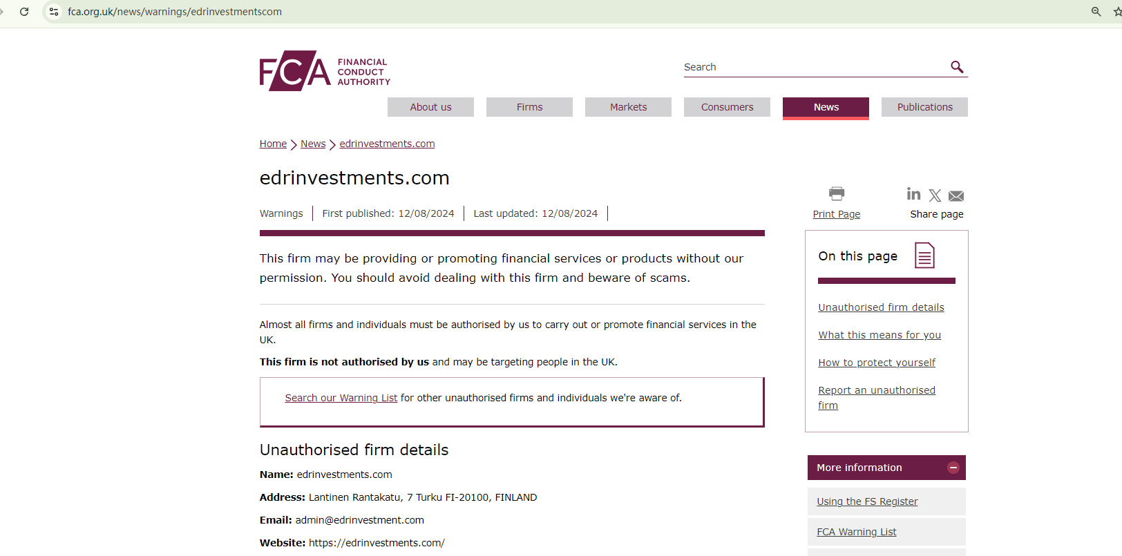 Additionally, the Financial Conduct Authority (FCA) has issued a warning against edrinvestments.com for lacking the required authorization.