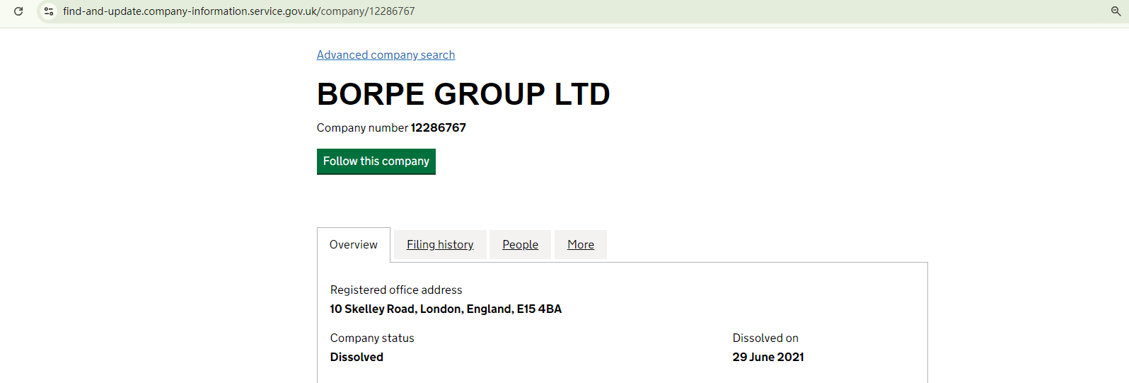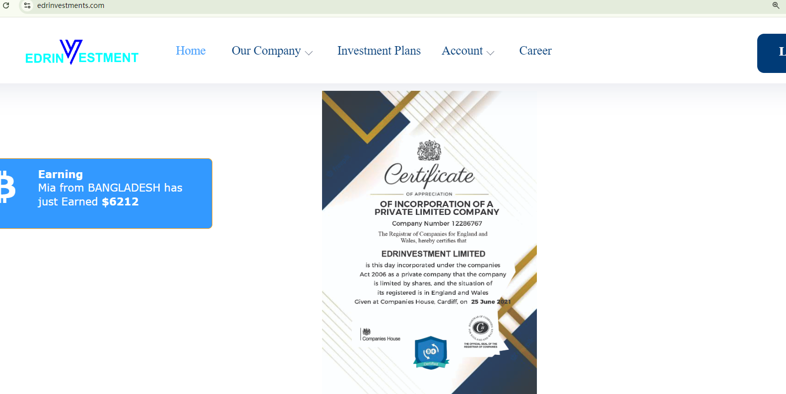 The website edrinvestments.com provides a fake certificate allegedly from Companies House (CH). Our search for the claimed company number in the CH register revealed a dissolved company with a different name.