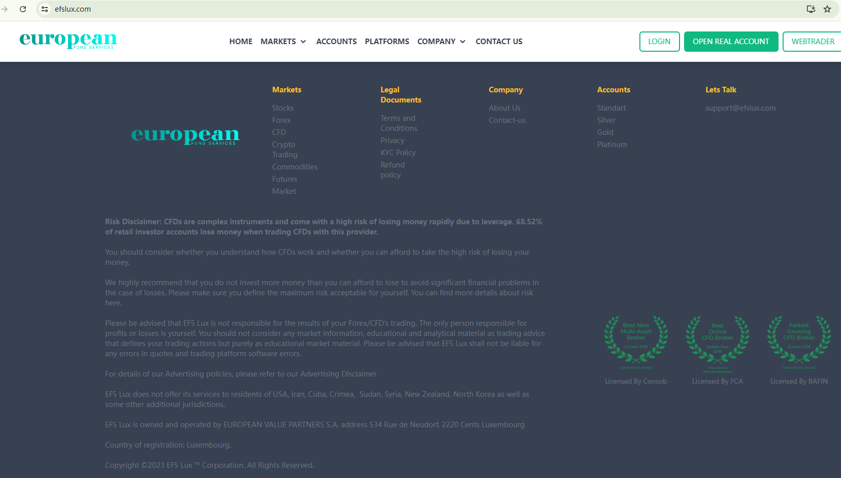 EFS Lux claims to be regulated by several financial authorities within Europe but fails to provide detailed licensing information to substantiate these claims, raising doubts about its credibility. Our search in the European Securities and Markets Authority (ESMA) register yielded no records to support the company's legitimacy.