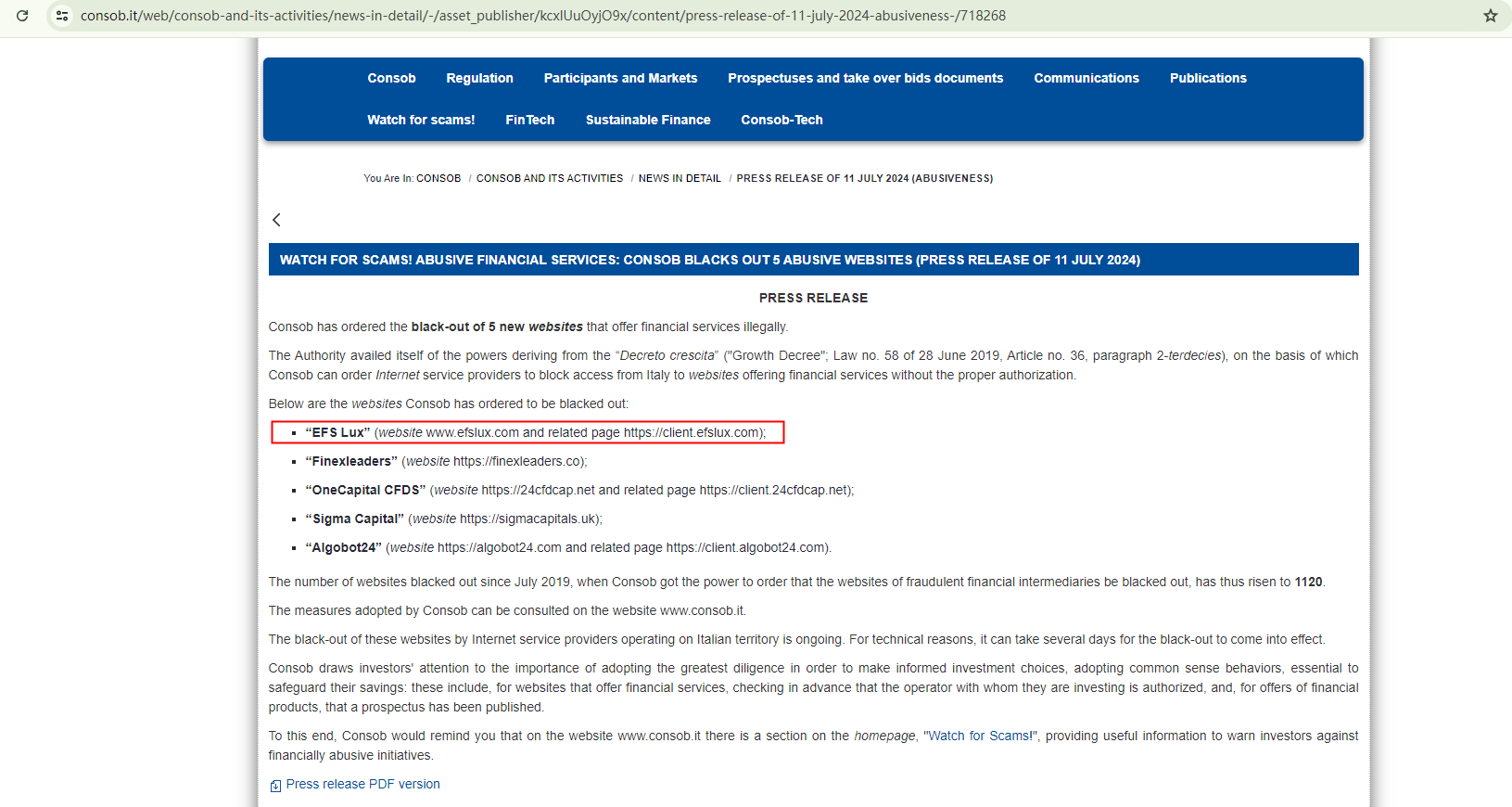 Additionally, the Italian Companies and Exchange Commission (CONSOB) has ordered EFS Lux's website to be blacked out, stating that it offers financial services illegally in Italy