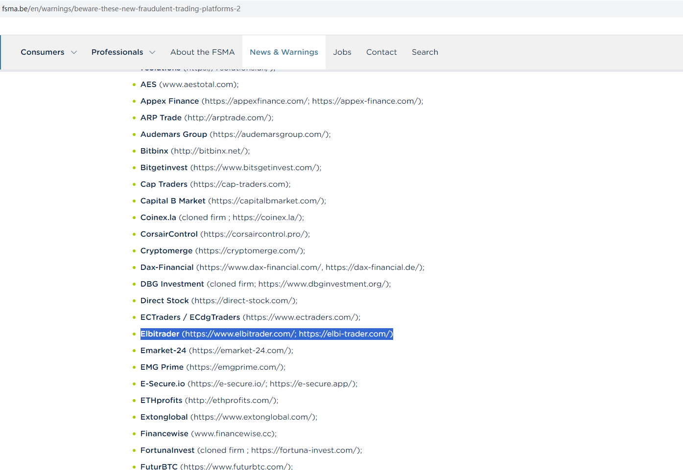 The Financial Services and Markets Authority (FSMA) issued a warning that Elbitrader was providing finacial services or products without authorisation.