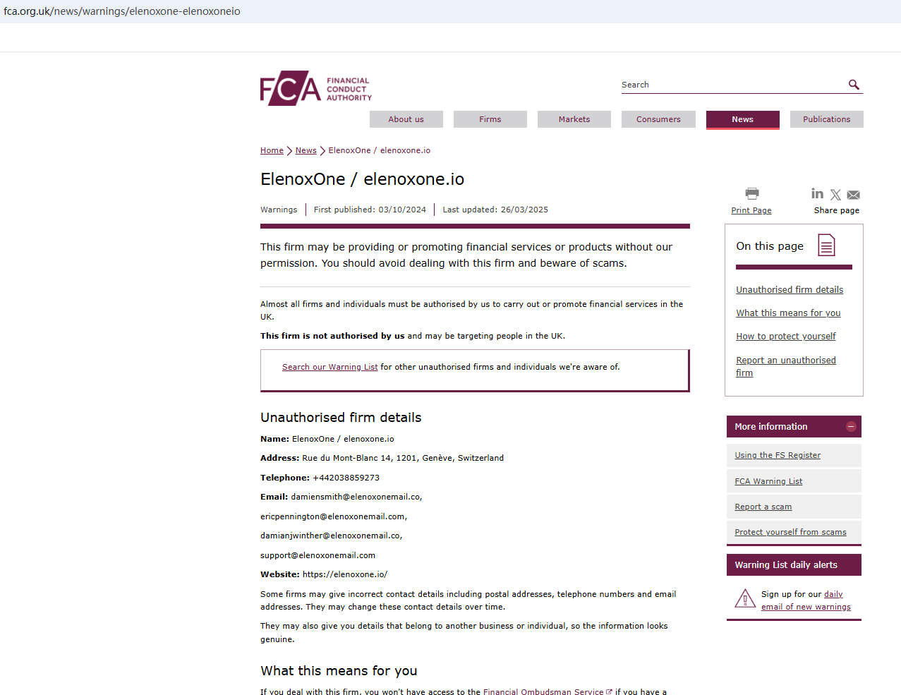 On March 26, 2025, the Financial Conduct Authority (FCA) issued a warning against ElenoxOne for the lack of the required authorization. https://www.fca.org.uk/news/warnings/elenoxone-elenoxoneio