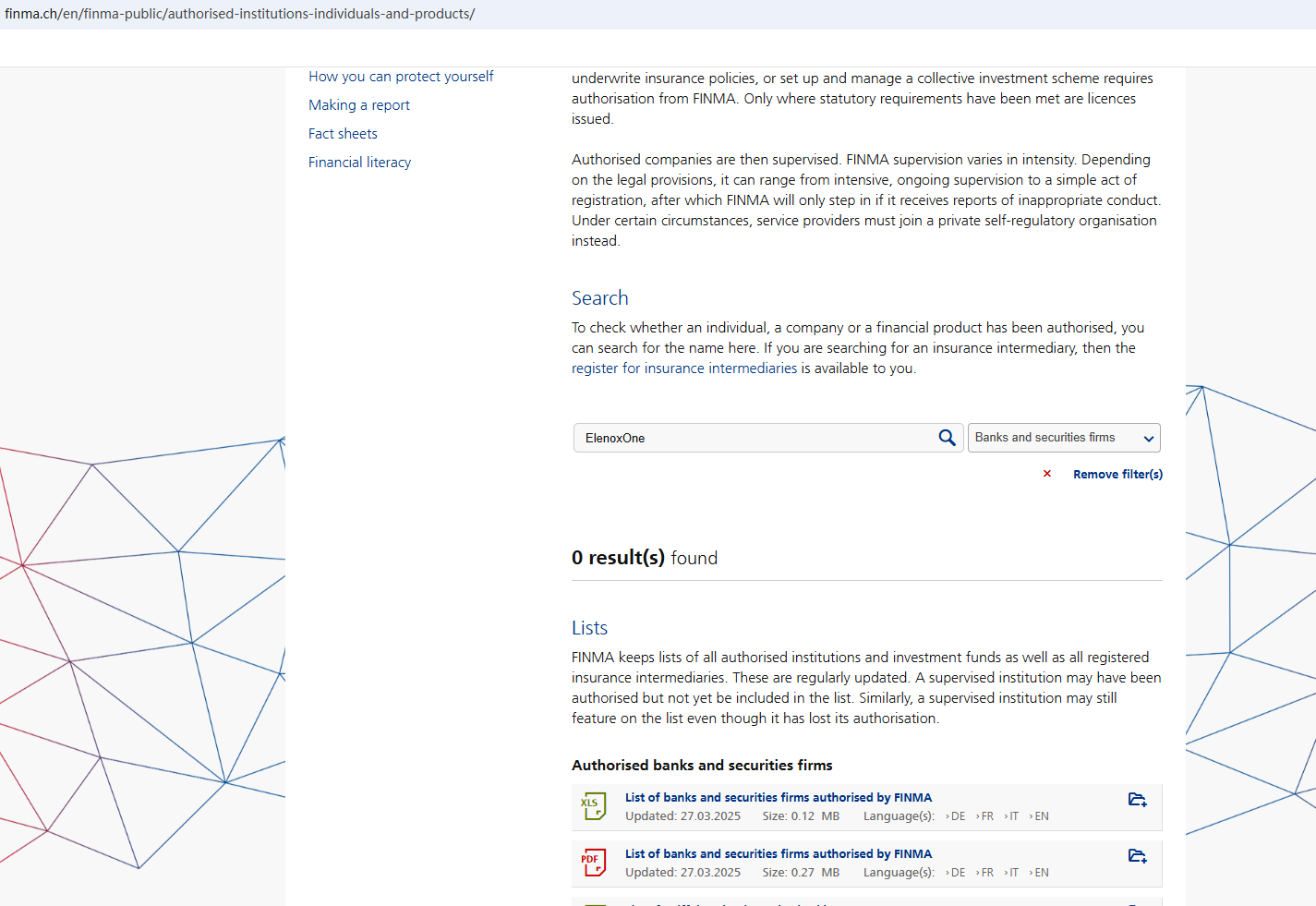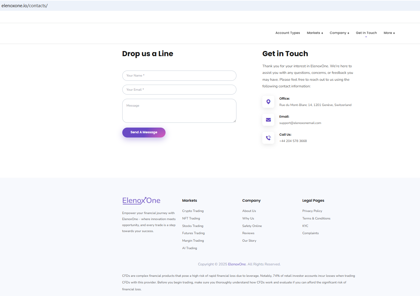 According to its website, it is located in Switzerland. Upon investigation, no matching information was found in the Swiss Financial Market Supervisory Authority (FINMA). What's more, the Financial Conduct Authority (FCA) issued a warning against ElenoxOne for the lack of the required authorization.