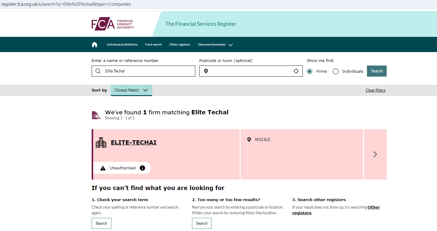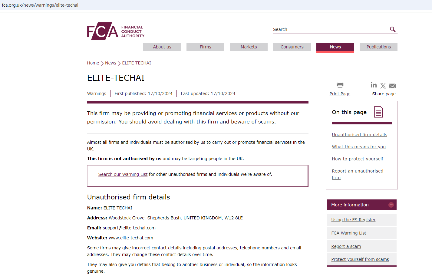 Upon investigation, we found that ELITE-TECHAI is not authorized and regulated by the United Kingdom Financial Conduct Authority (FCA). and the United Kingdom Financial Conduct Authority (FCA) issued a warning against ELITE-TECHAI, believing this company might be providing financial services or products without authorisation in the UK.