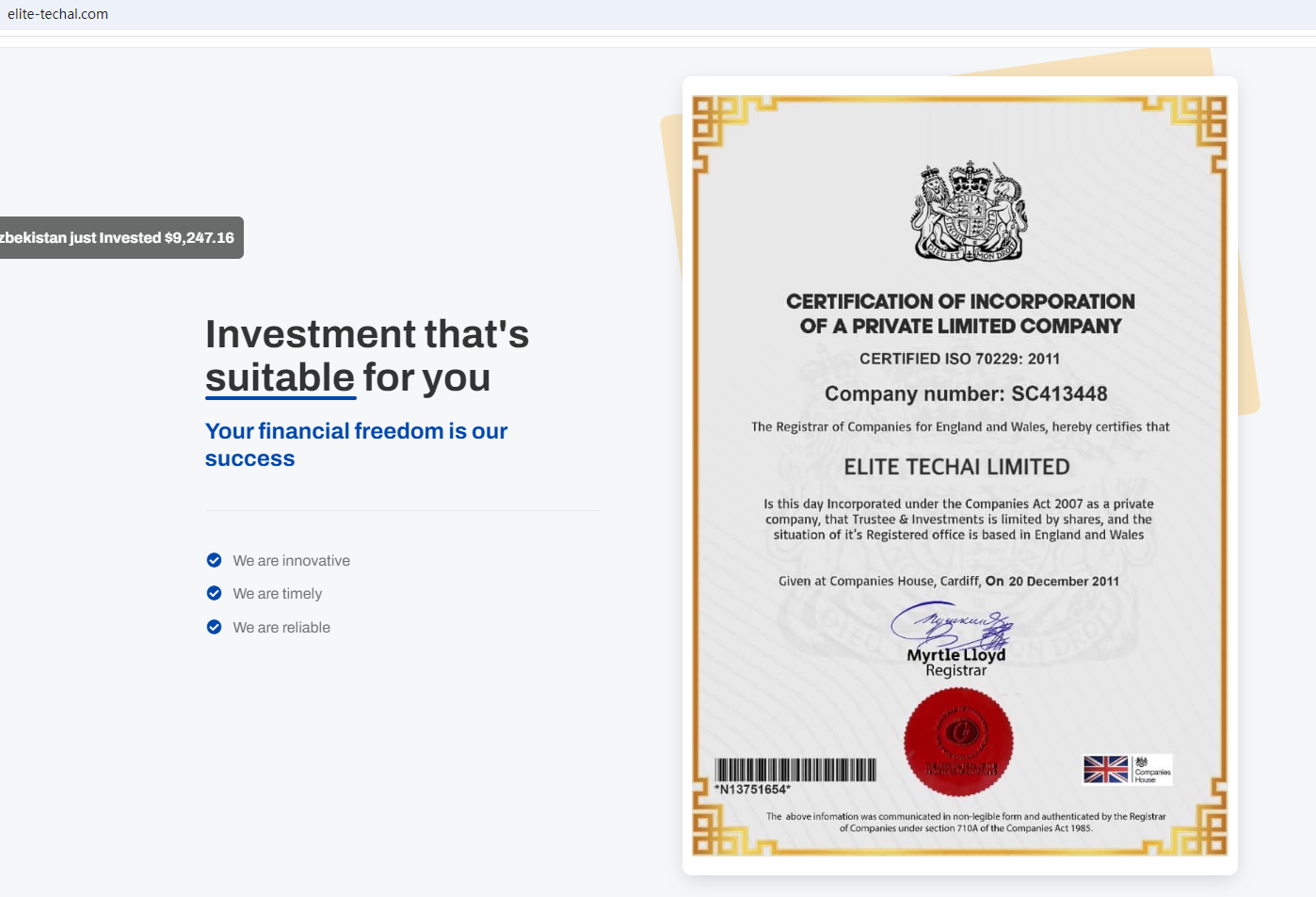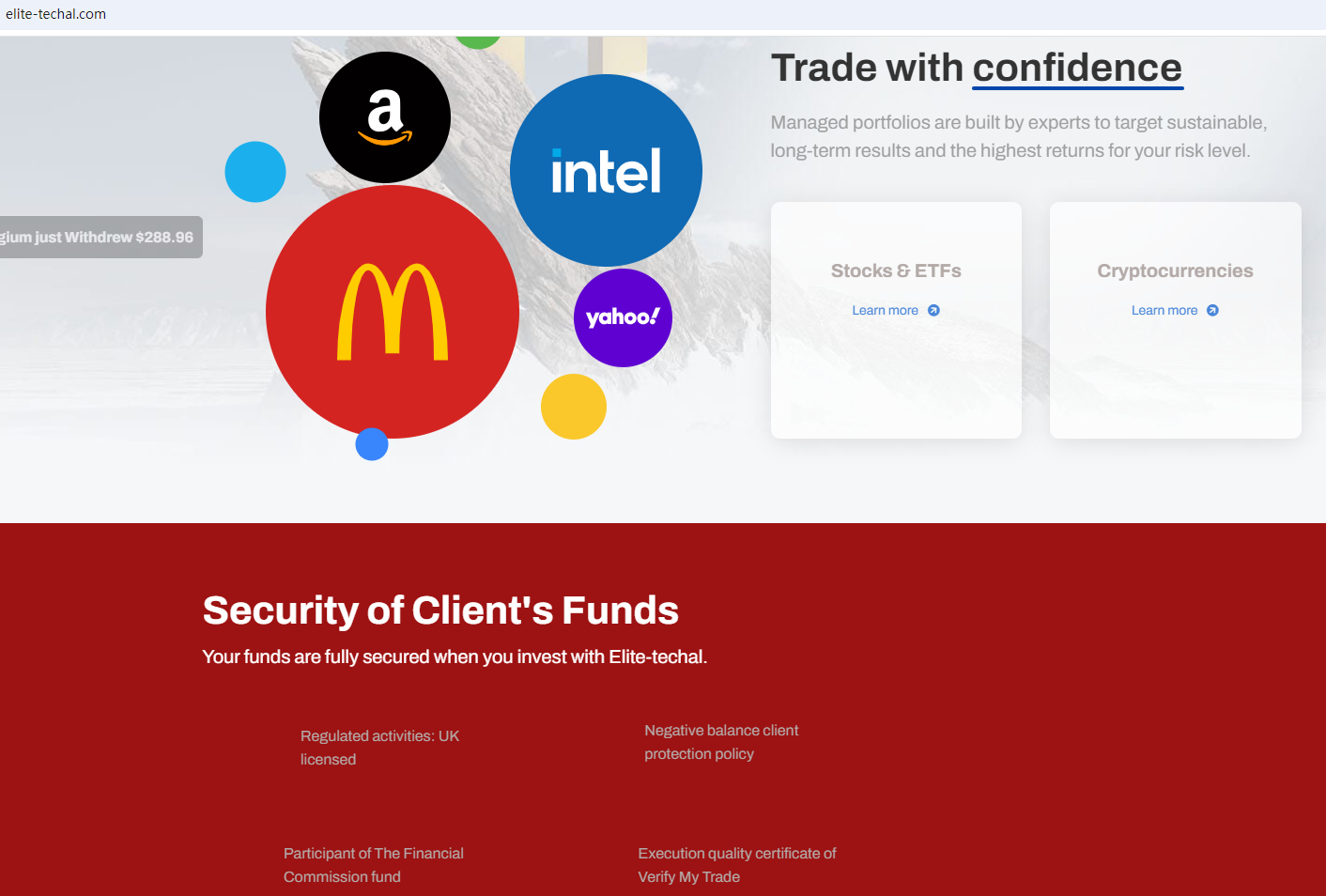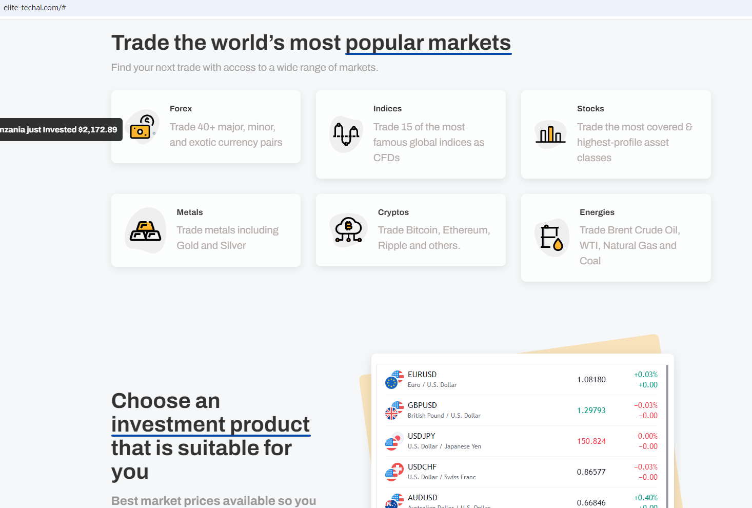 Elite-Techal claims to be an international financial company licensed and regulated by the UK, offering a range of investment products to traders, including Forex, Indices, Stocks, Metals, Cryptos, Energies and more instruments for trading in global markets.