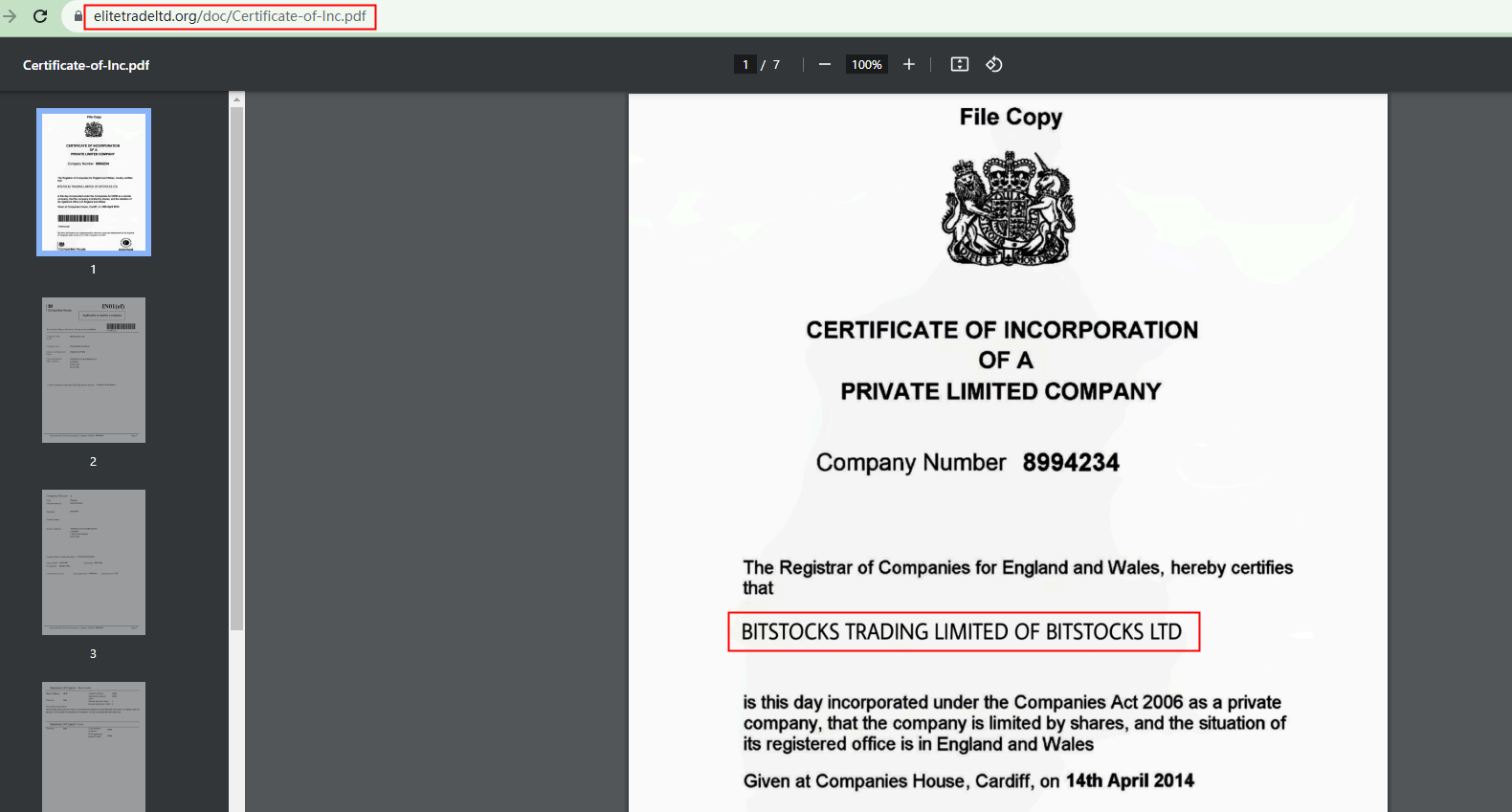 Furthermore, it is strange that its link labeled "Certificate of Incorporation" directs a CH license under Bitstocks Ltd, a company that appears to have nothing to do with Elitetradeltd. In addition, mere registration with the CH doesn't mean being authorized to legally provide financial services or products in the UK. Therefore, even if the CH certificate were true and these two companies were associated, Elitetradeltd remains unlicensed.