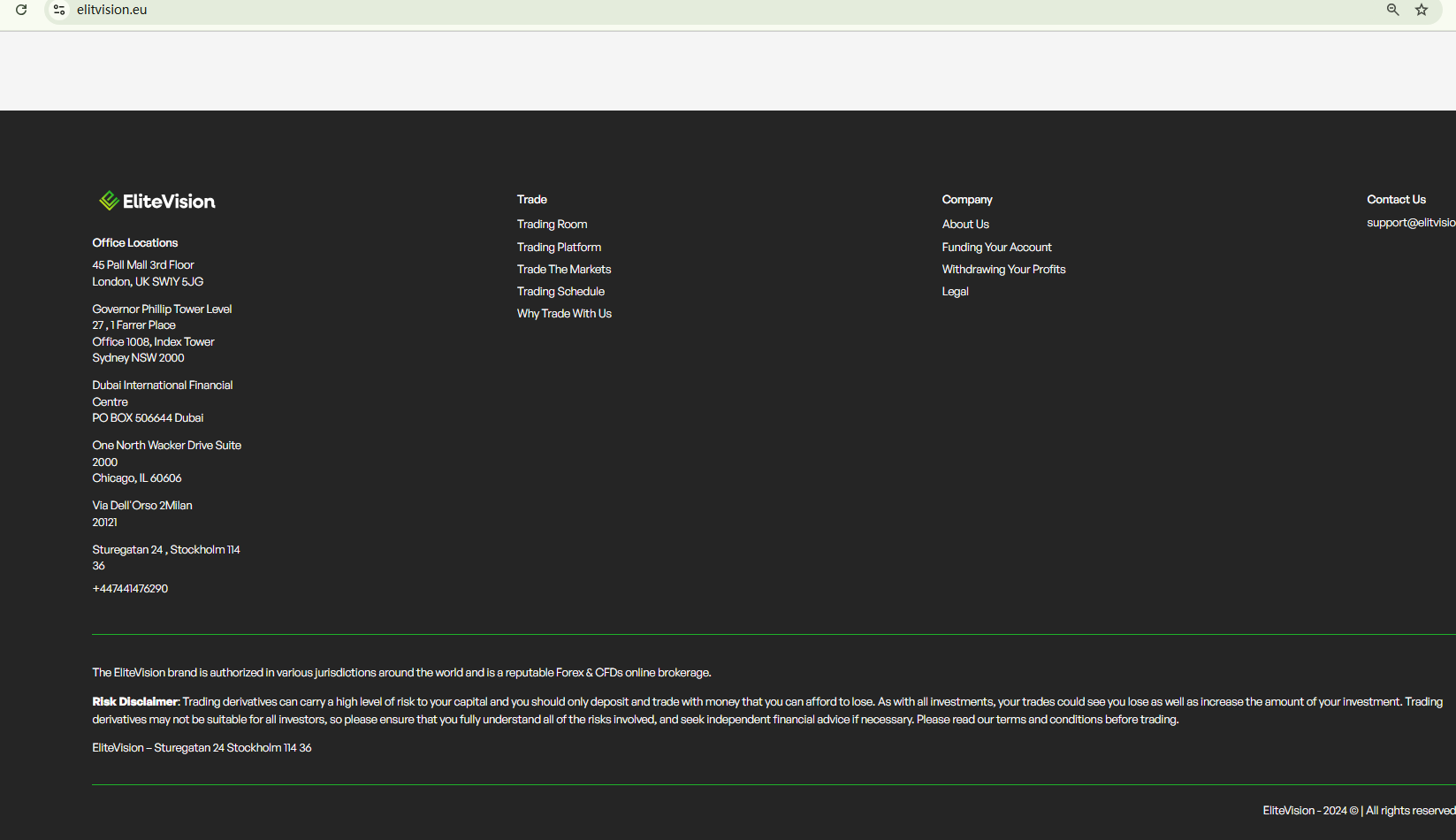 We haven't found any valid information to suggest that ELITEVISION is properly licensed or regulated. While it lists many addresses in the footer to appear real and international, our research indicates that these addresses may not truely associated with ELITEVISION. In addition, the Comisión Nacional del Mercado de Valores (CNMV) has added ELITEVISION to its warning list for providing investment services without authorization. This is indeed a major red flag.