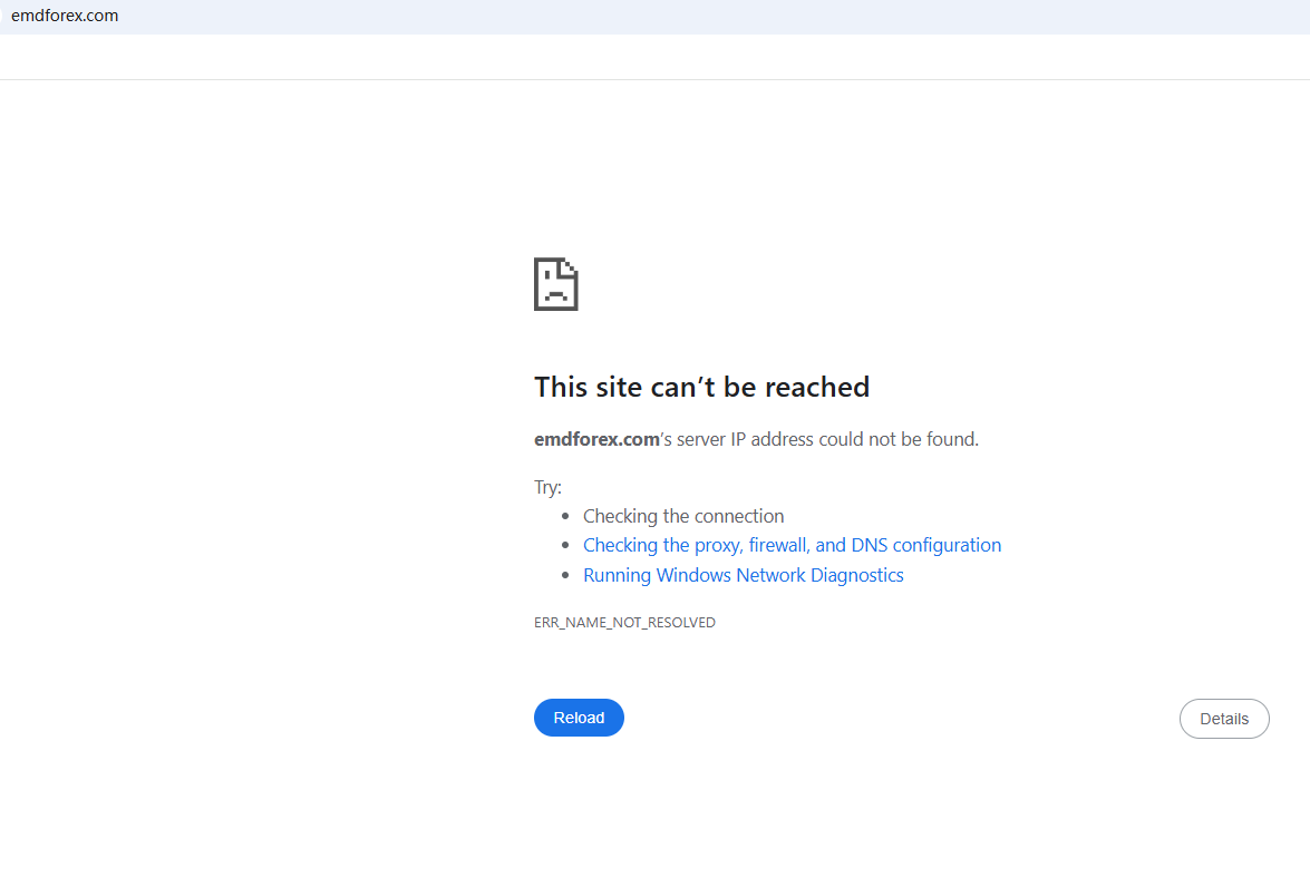 BrokersView found that the domain "https://emdforex.com/" is currently inaccessible. This is widely regarded as a significant red flag, as the suspension of a broker's website often points to underlying regulatory or operational issues.