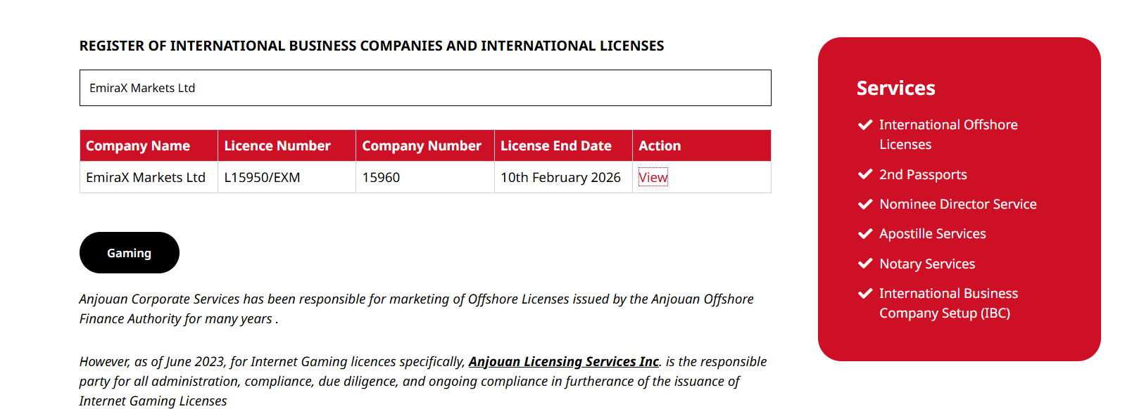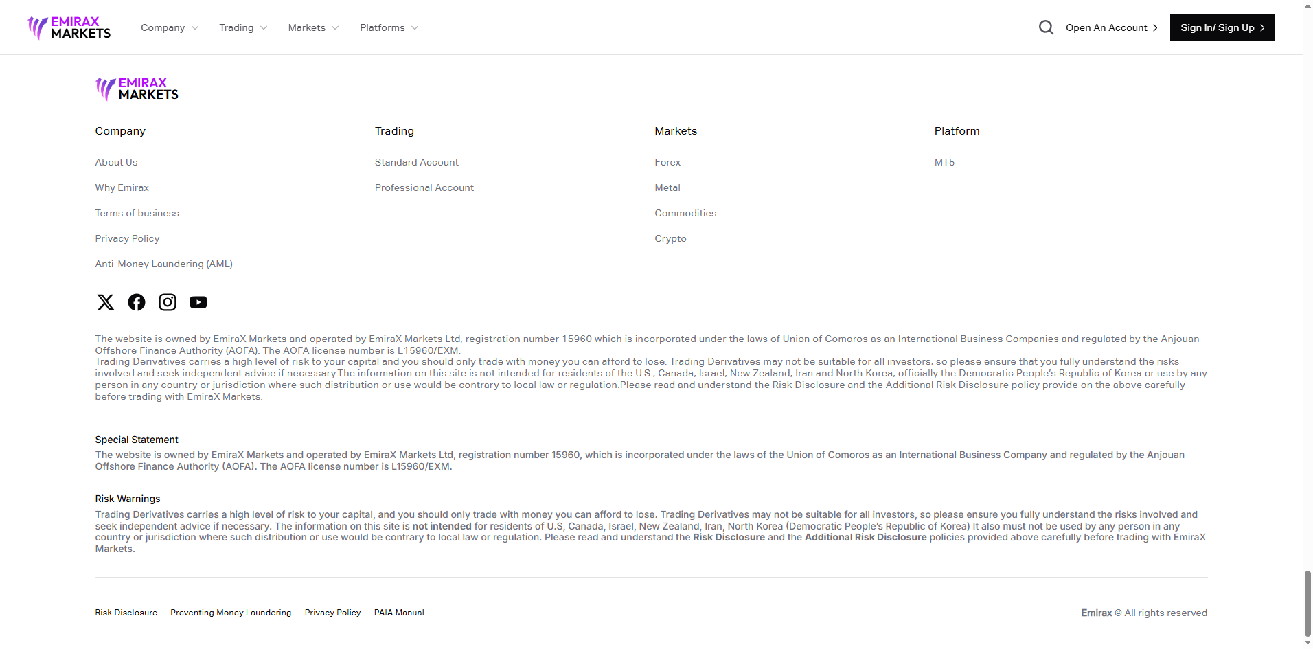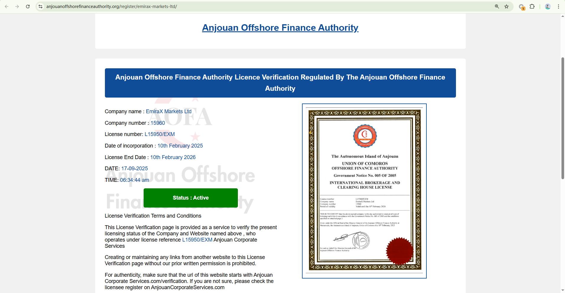 Emirax Markets claims to be operated by EmiraX Markets Ltd, regulated by the Anjouan Offshore Finance Authority (AOFA). While a matching entity appears in AOFA’s licensee list, this regulation alone does not ensure legitimacy. AOFA is known for extremely weak oversight and low regulatory standards, offering minimal investor protection. Moreover, AOFA does not disclose the licensed entity's domain names, making it difficult to confirm the platform’s official link to the licensed entity. Therefore, Emirax Markets is not a reliable platform and carries a high risk of fraud.