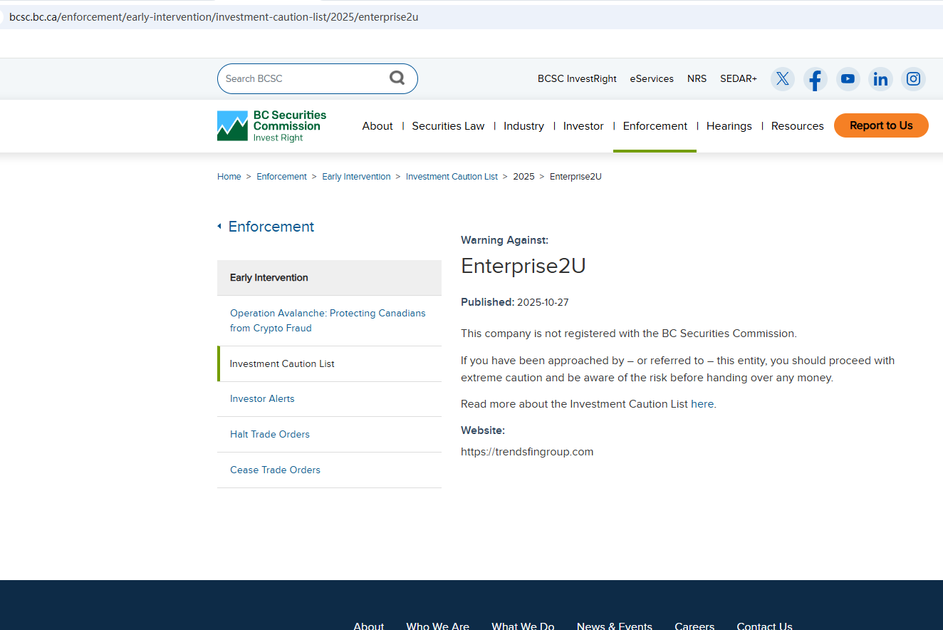 On Oct 27, 2025, the British Columbia Securities Commission (BCSC) issued a warning against Enterprise2U, stating that this broker is not registered to trade in, or advise on, securities or derivatives in BC. https://www.bcsc.bc.ca/enforcement/early-intervention/investment-caution-list/2025/enterprise2u