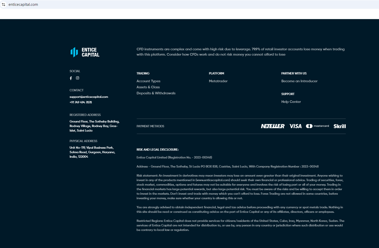 Entice Capital claims to be registered in St. Lucia, promoting this registration as proof of its legitimacy. However, forex trading activities are not licensed in St. Lucia. Therefore, Entice Capital is not regulated at all. Entrusting it with investors' funds is highly risky, as there are no legal protections in place to safeguard the funds.