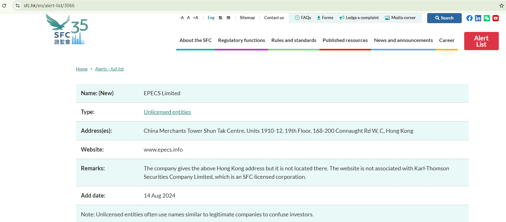 On August 14, 2024, the Hong Kong Securities and Futures Commission (HK SFC) issued a warning about EPECS Limited. The warning stated that the company claimed a false location and is not related to the SFC-licensed corporation, Karl-Thomson Securities Company Limited. https://www.sfc.hk/en/alert-list/3066