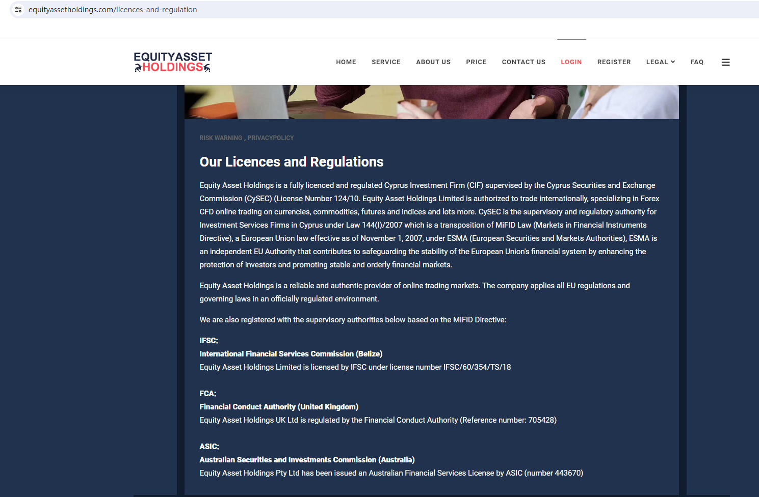 On February 22, 2024, the Cyprus Securities and Exchange Commission (CySEC) warned consumers about the services offered by the company Equity Asset Holdings, which is offering financial and investment services without the required authorization. https://www.cysec.gov.cy/CMSPages/GetFile.aspx?guid=5d357967-8b7c-441f-9ed4-34a2ff2c12e2