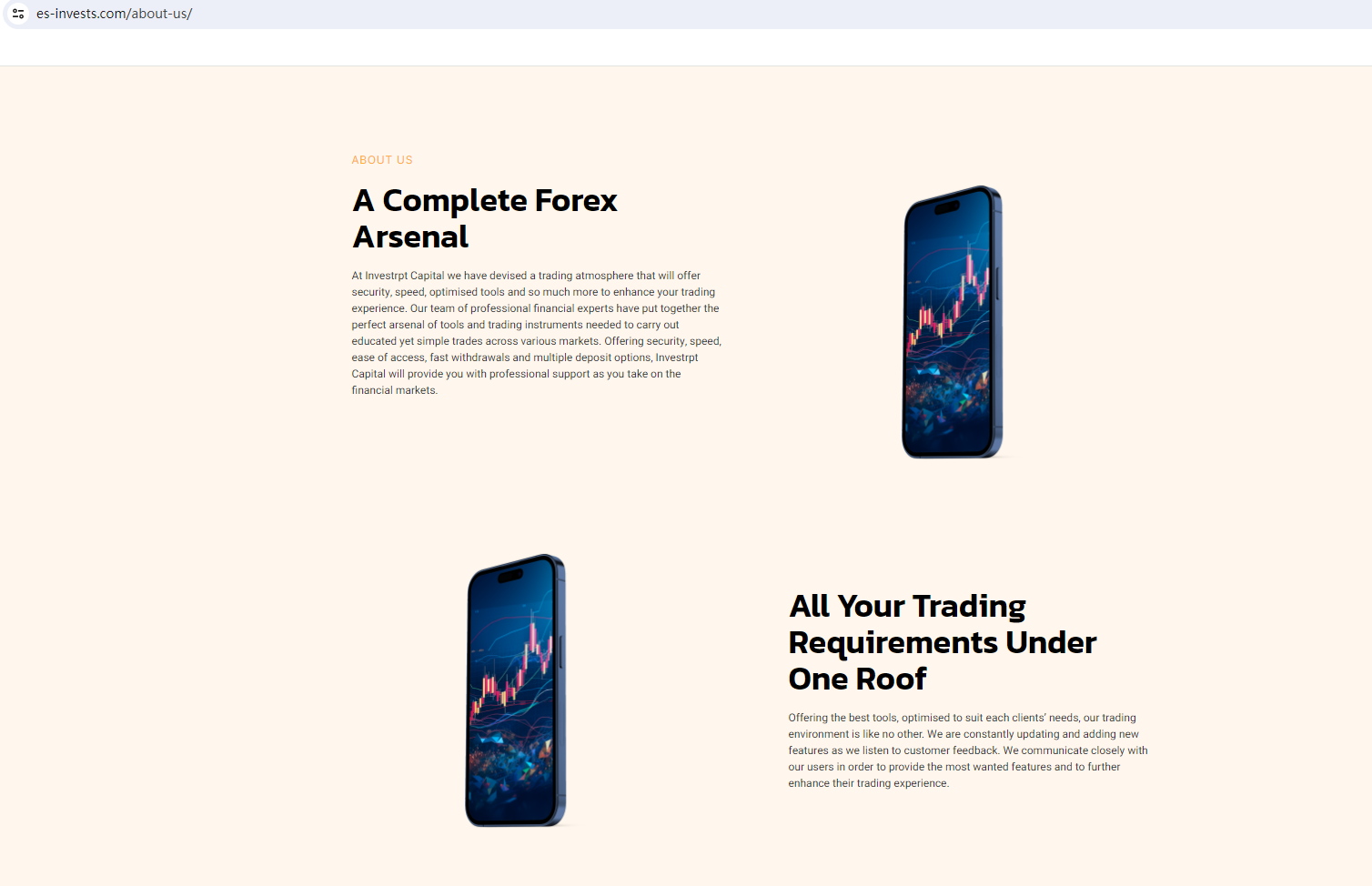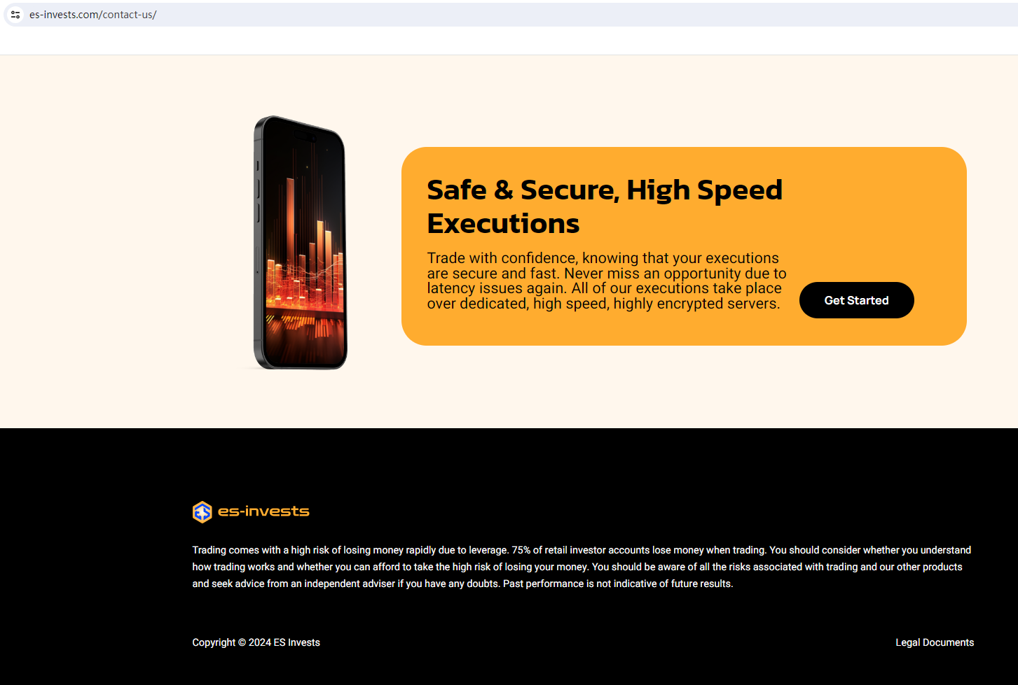 ES INVESTS claims to be a reliable company without presenting any information about its regulation or contact. The lack of such important information may be a distinct signal of an unlicensed broker, as regulated companies always present their accreditations and licenses in a prominent position. It is a red flag.