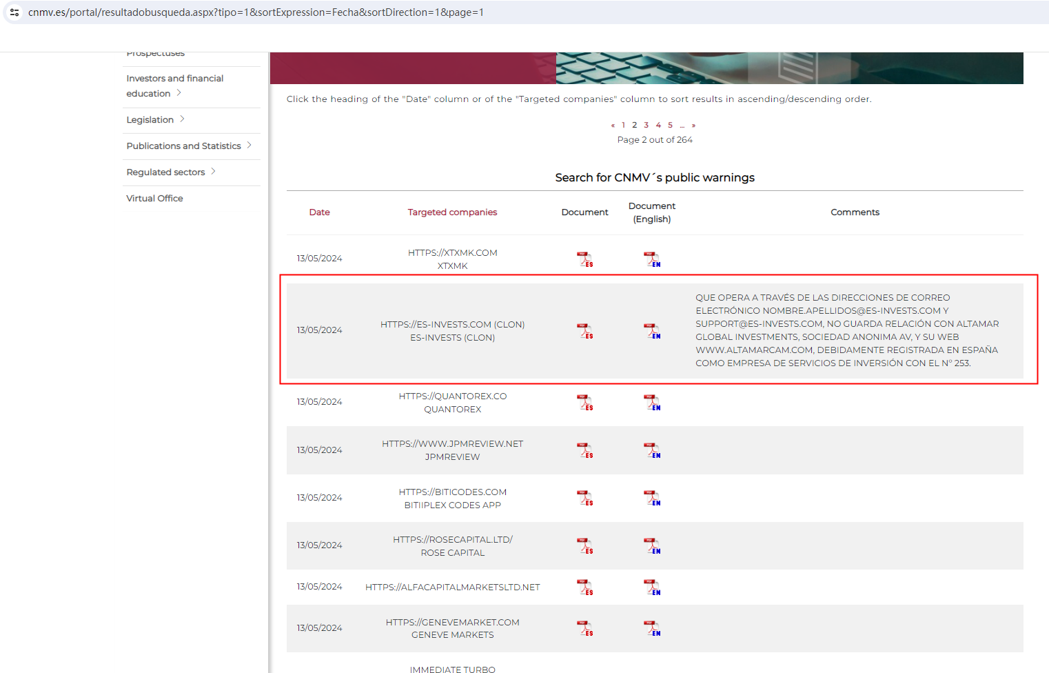 The Comisión Nacional del Mercado de Valores (CNMV) issued a warning against ES INVESTS, identifying this company as a clone of an CNMV-authorized firm.