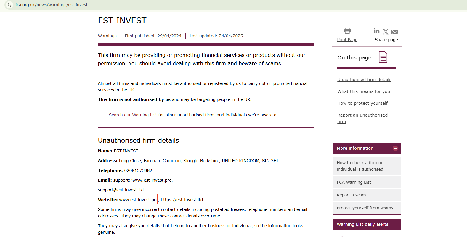 On 29 April 2024, the United Kingdom Financial Conduct Authority (UK FCA) issued a warning that EST INVEST was providing financial services or products in the UK without authorisation. You may visit: https://www.fca.org.uk/news/warnings/est-invest