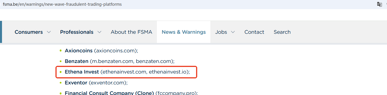 On July 24, 2025, the Financial Services and Markets Authority (FSMA) issued a warning about Ethena Invest for the lack of the required authorization. https://www.fsma.be/en/warnings/new-wave-fraudulent-trading-platforms
