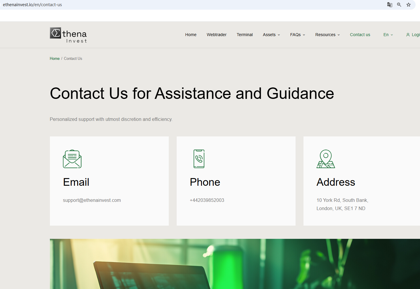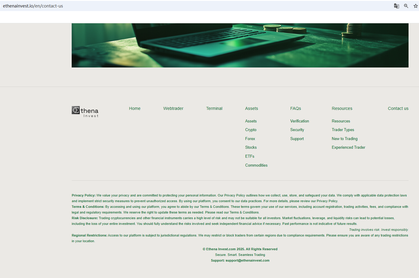 According to its website, it is located in the UK. Upon investigation, no matching information was found in the Financial Conduct Authority (FCA). What's more, the Financial Services and Markets Authority (FSMA) issued a warning about Ethena Invest for the lack of the required authorization.