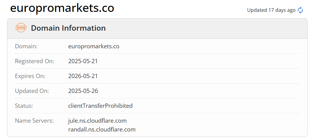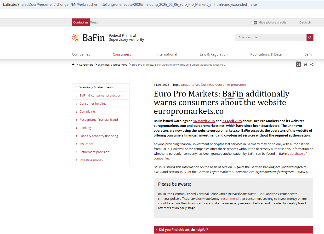According to its website, it claims to be a reliable company established in 2011. Upon investigation, we discovered that its domain name was not established until 2025, clearly contradicting the facts. Furthermore, it does not disclose any valid regulatory information on its website, not even the most basic office address, which is highly untrustworthy. More notably, we discovered that the Federal Financial Supervisory Authority (BaFin) issued a warning against Euro Pro Markets for the lack of the required authorization.