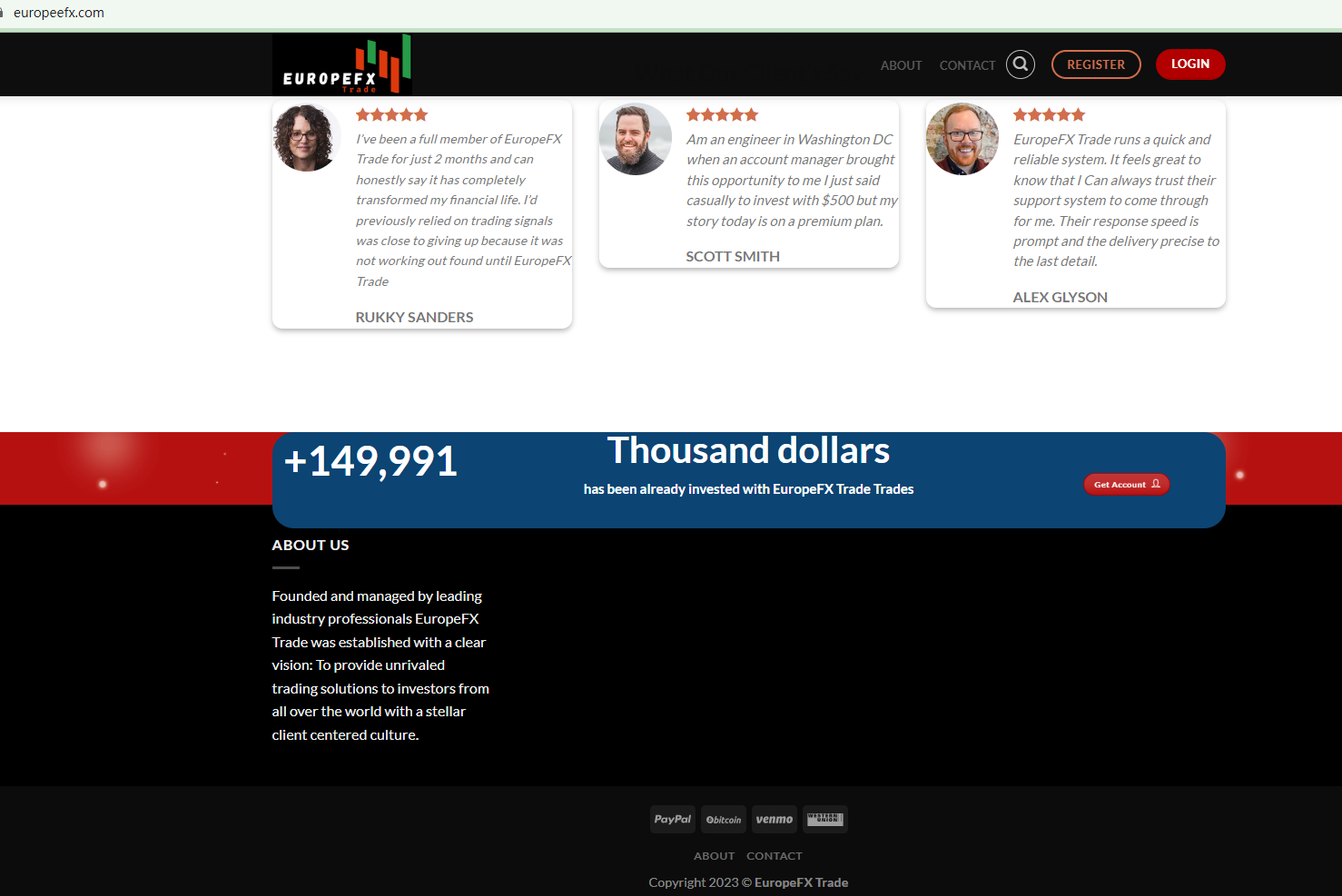 EuropeFx Trade pretends to be a safe forex broker, but fails to disclose any regulatory information. This is a sign of a scam.