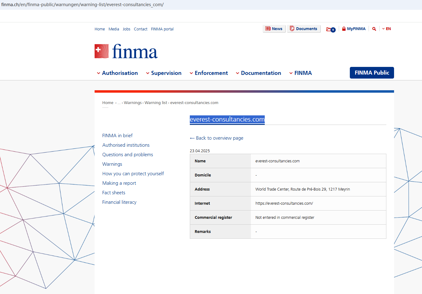 According to its website, it is located in Switzerland. Upon investigation, we found that the Swiss Financial Market Supervisory Authority (FINMA) issued a warning against Everest Consultancies, stating that this broker had not entered into its commercial register.
