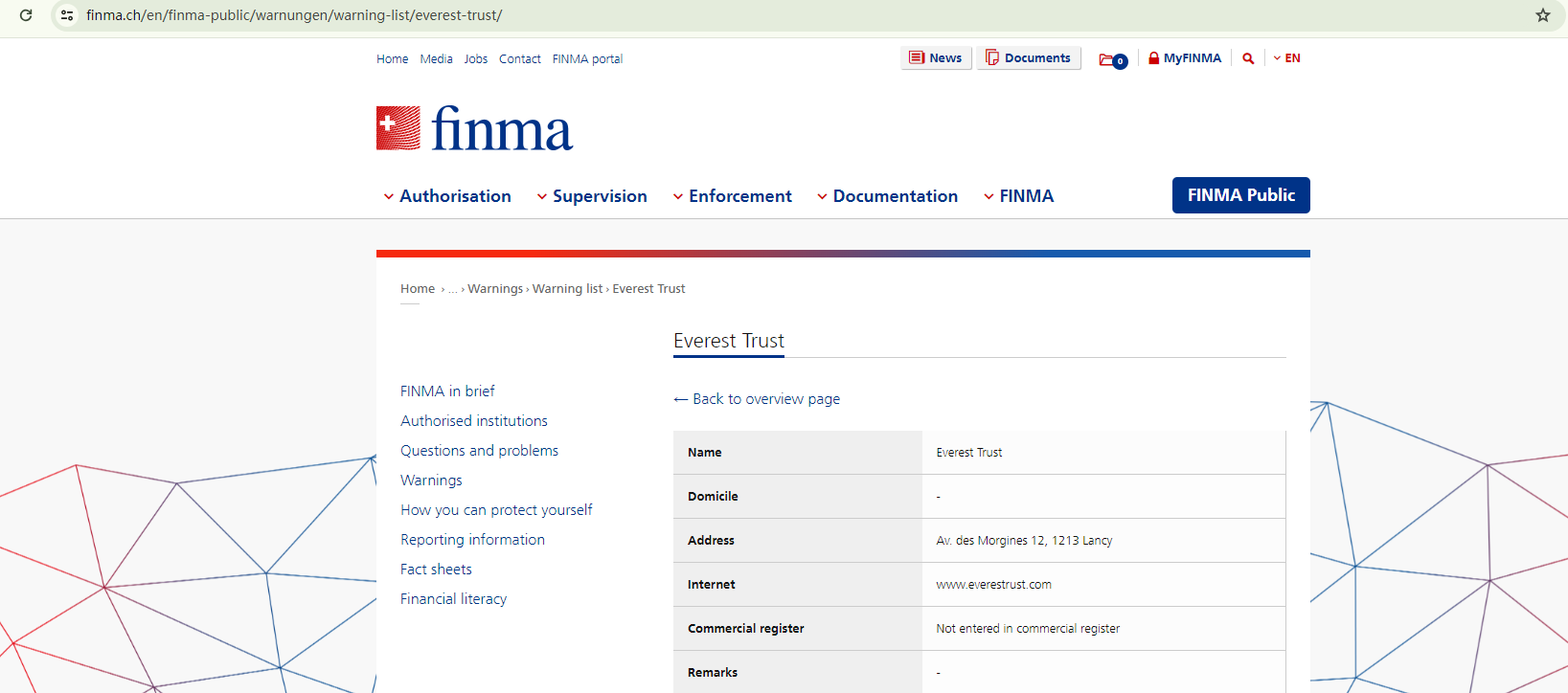Adding to these concerns, the Swiss Financial Market Supervisory Authority (FINMA) has issued a warning against Everest Trust. According to FINMA, Everest Trust is not listed in its commercial register, indicating that the broker may be operating without the necessary authorization.