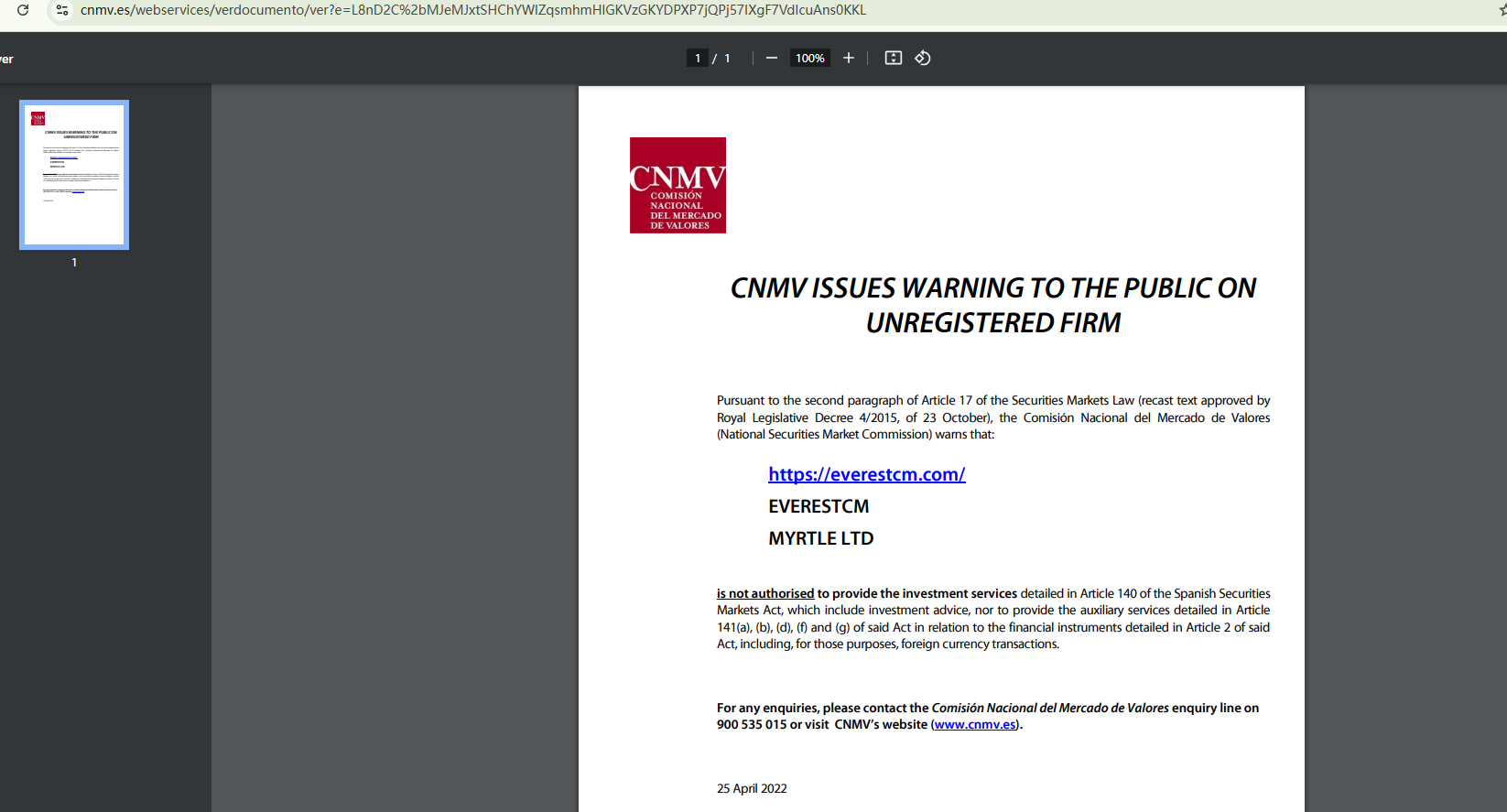 On April 25, 2022, the Comisión Nacional del Mercado de Valores (CNMV) issued a warning about EverestCM for carrying on unlicensed investment activities. https://cnmv.es/portal/ResultadoBusqueda?tipo=1&nombre=EVERESTCM.COM/