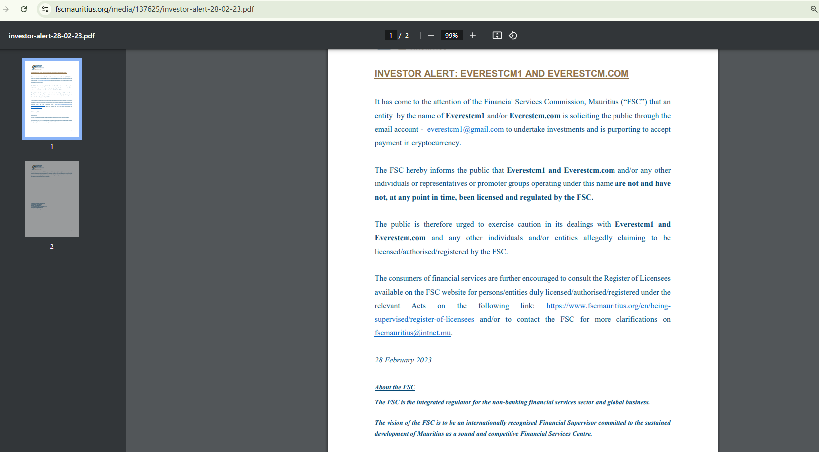 On February 28, 2023, the Mauritius Financial Services Commission (Mauritius FSC) issued a warning against EverestCM, noting that this entity is not licensed or regulated by them. https://www.fscmauritius.org/media/137625/investor-alert-28-02-23.pdf