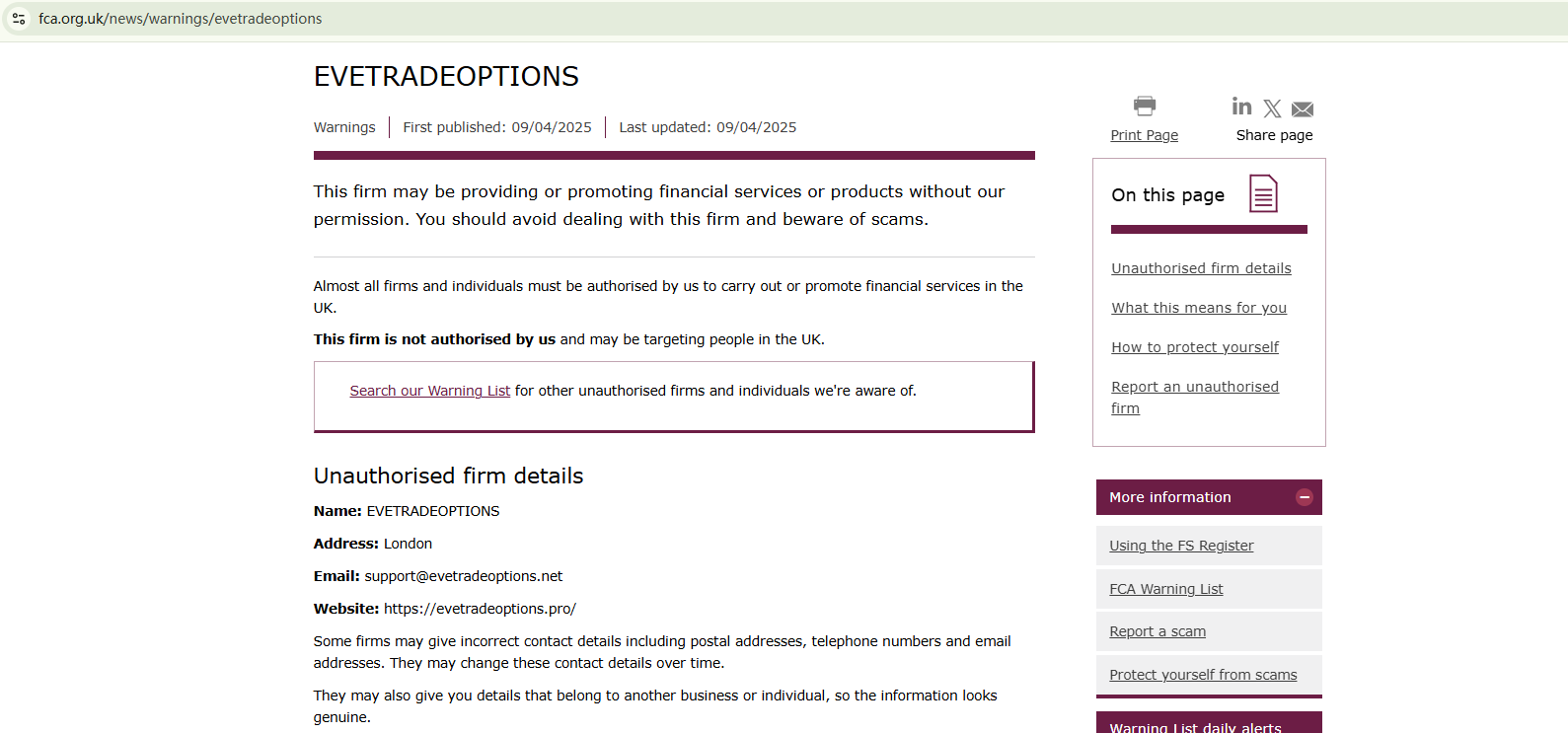 On April 9, 2025, the Financial Conduct Authority (FCA) issued a warning against EVETRADEOPTIONS, believing this company might be providing financial services or products without proper authorization in the UK. https://www.fca.org.uk/news/warnings/evetradeoptions