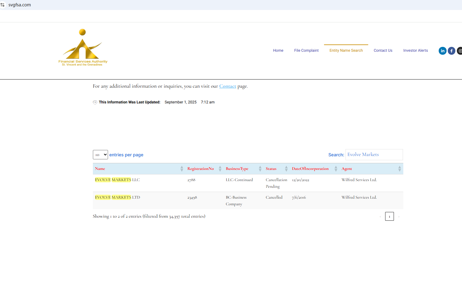 The website of Evolve Markets is currently unavailable. The claimed registration with the Financial Services Authority of St. Vincent and the Grenadines (SVG FSA) has been cancelled as well. All the signs indicate substantial risks of Evolve Markets. Investors should be informed about the development and stay clear of it.