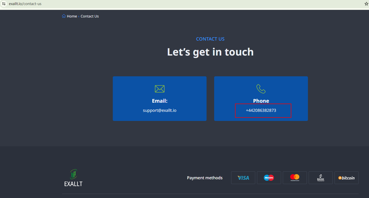 The customer service hotline begins with +44, implying a possible UK office. However, Exallt, or Fluxlogy LLC, hasn't complied with UK law by obtaining the necessary authorization from the Financial Conduct Authority (FCA).
