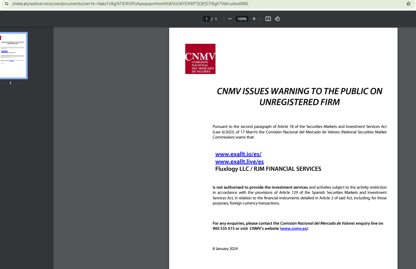 On January 8, 2024, the Comisión Nacional del Mercado de Valores (CNMV) added Exallt to its warning list for providing investment services without authorization. https://www.cnmv.es/portal/ResultadoBusqueda.aspx?tipo=1&nombre=Fluxlogy%20LLC