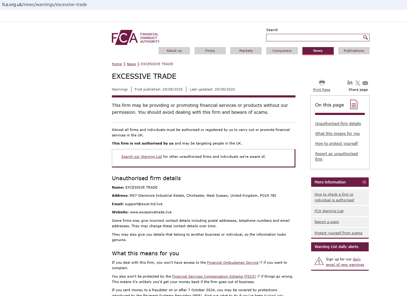This indicates that Excessive Trade is offering services in the UK without proper regulatory approval, which raises significant concerns about its legitimacy and potential to be a scam.