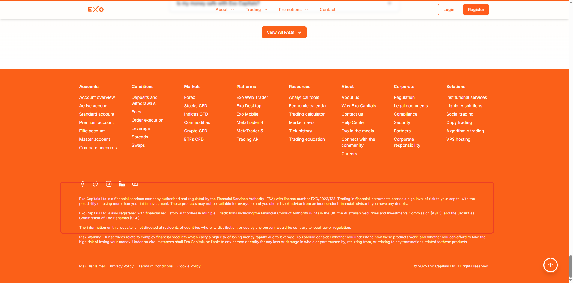 Exo Capitals claims to operate under the name Exo Capitals Ltd and states that it is authorized by several well-known regulatory bodies—the Seychelles Financial Services Authority (FSA), the UK’s Financial Conduct Authority (FCA), the Australian Securities & Investments Commission (ASIC), and The Securities Commission of The Bahamas (SCB).