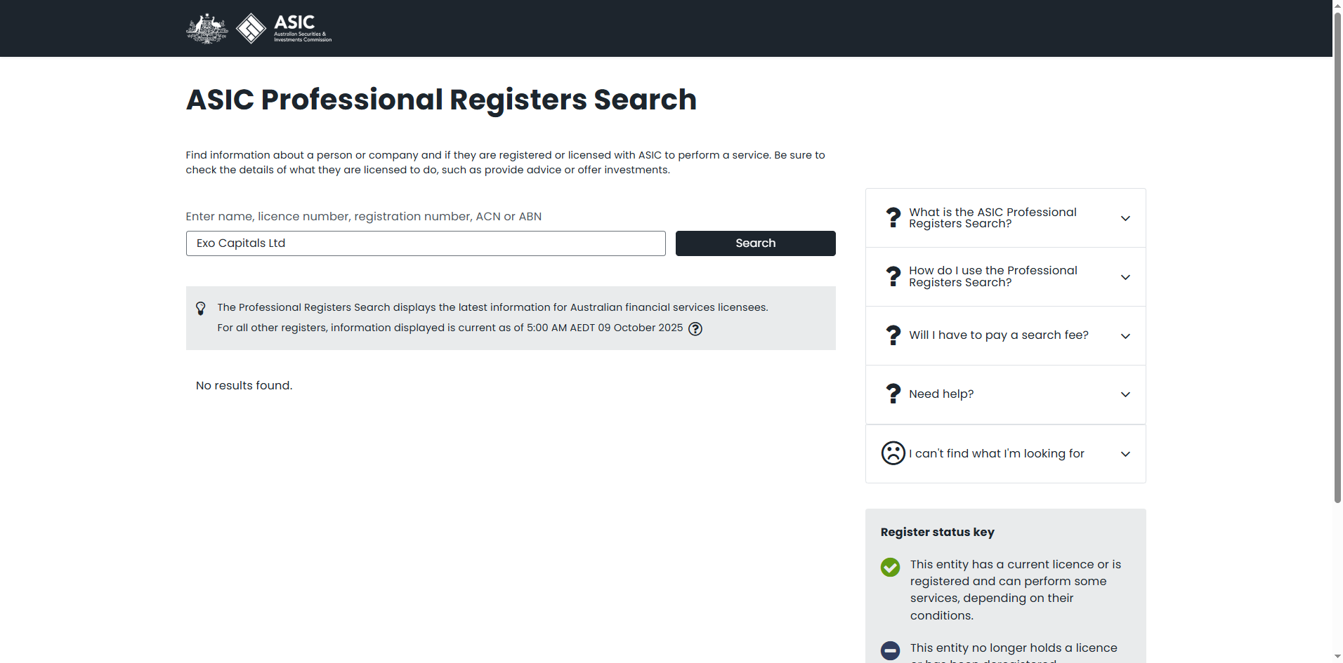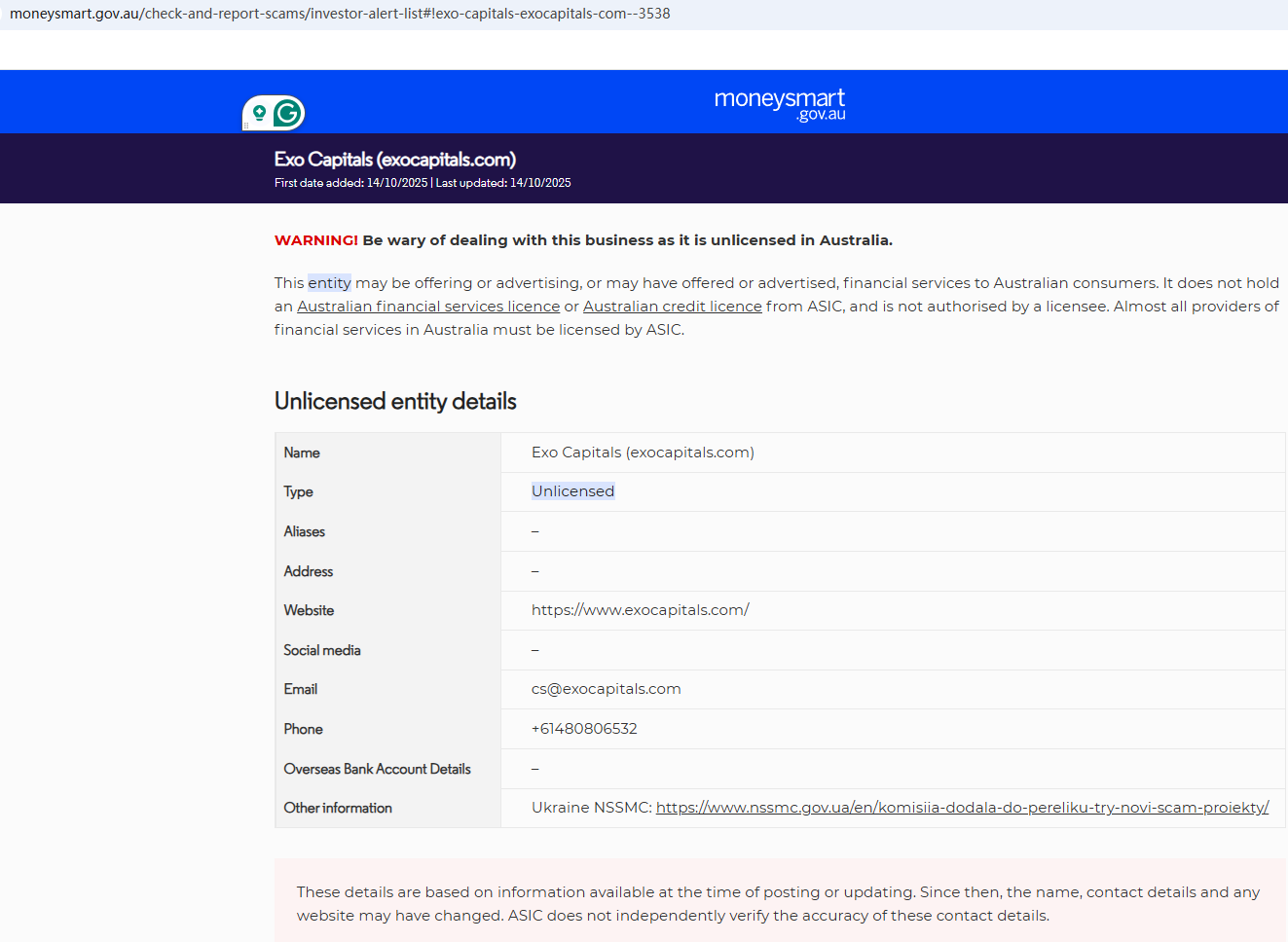 On Oct 14, 2025, the Australian Securities & Investments Commission (ASIC) issued a warning against Exo Capitals, believing this company might be providing financial services or products without proper authorization. https://moneysmart.gov.au/check-and-report-scams/investor-alert-list#!exo-capitals-exocapitals-com--3538